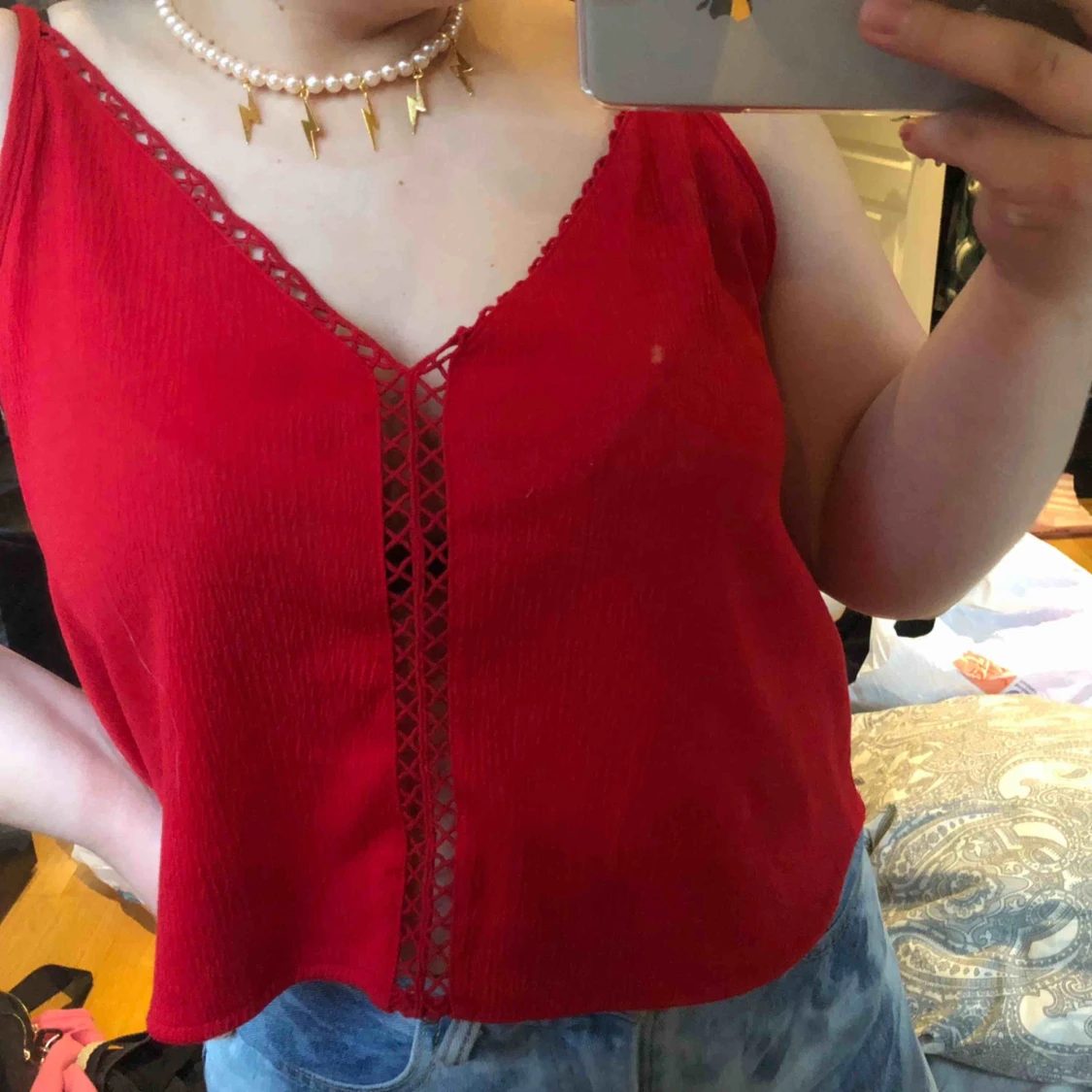 Ett rött linne med en fin detalj längs med tröjan. Är väldigt bekväm och bra till sommaren, passar bra till allt och har justerbara band! (Den är ganska kort men är längre ner än naveln)