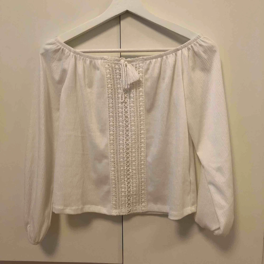 Vit somrig of shoulder tröja med mönster i mitten🤪 Väldigt bra skicka då jag använt endast ett par gånger💕 Alla plagg tvättas innan de fraktas och köparen står för frakten