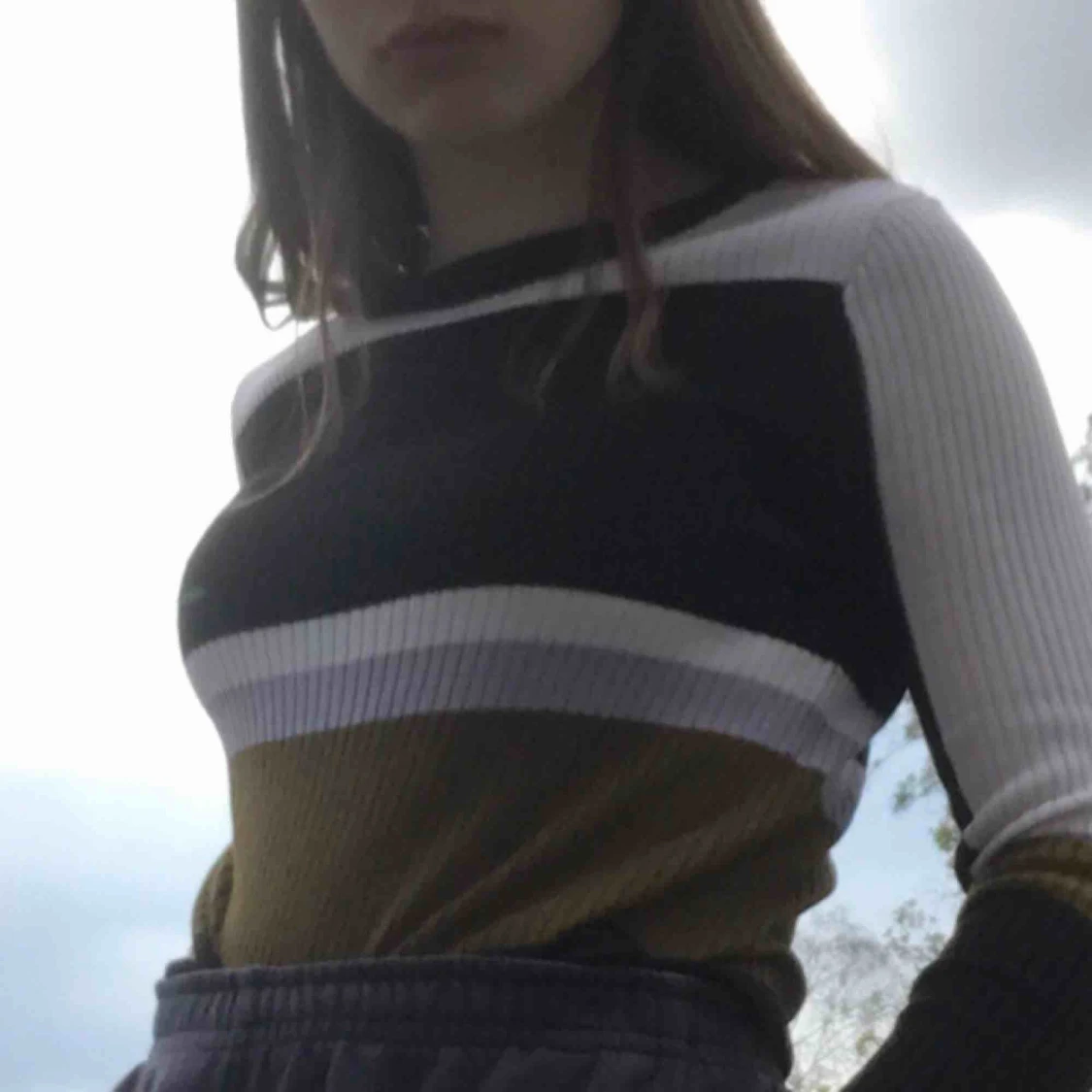 Jätteskön ribbad långärmad, med färgerna svart, vit, ljuslila och olivgrön. Passar bra till alla årstider!