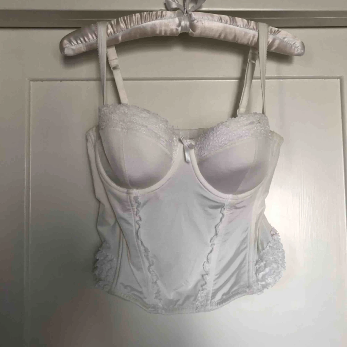 Vit korsett/bustier från HM. Står storlek 42, men passar 36-40 beroende på kupstorlek osv. Använd en gång. Kan mötas upp eller skickas för 30kr.😊