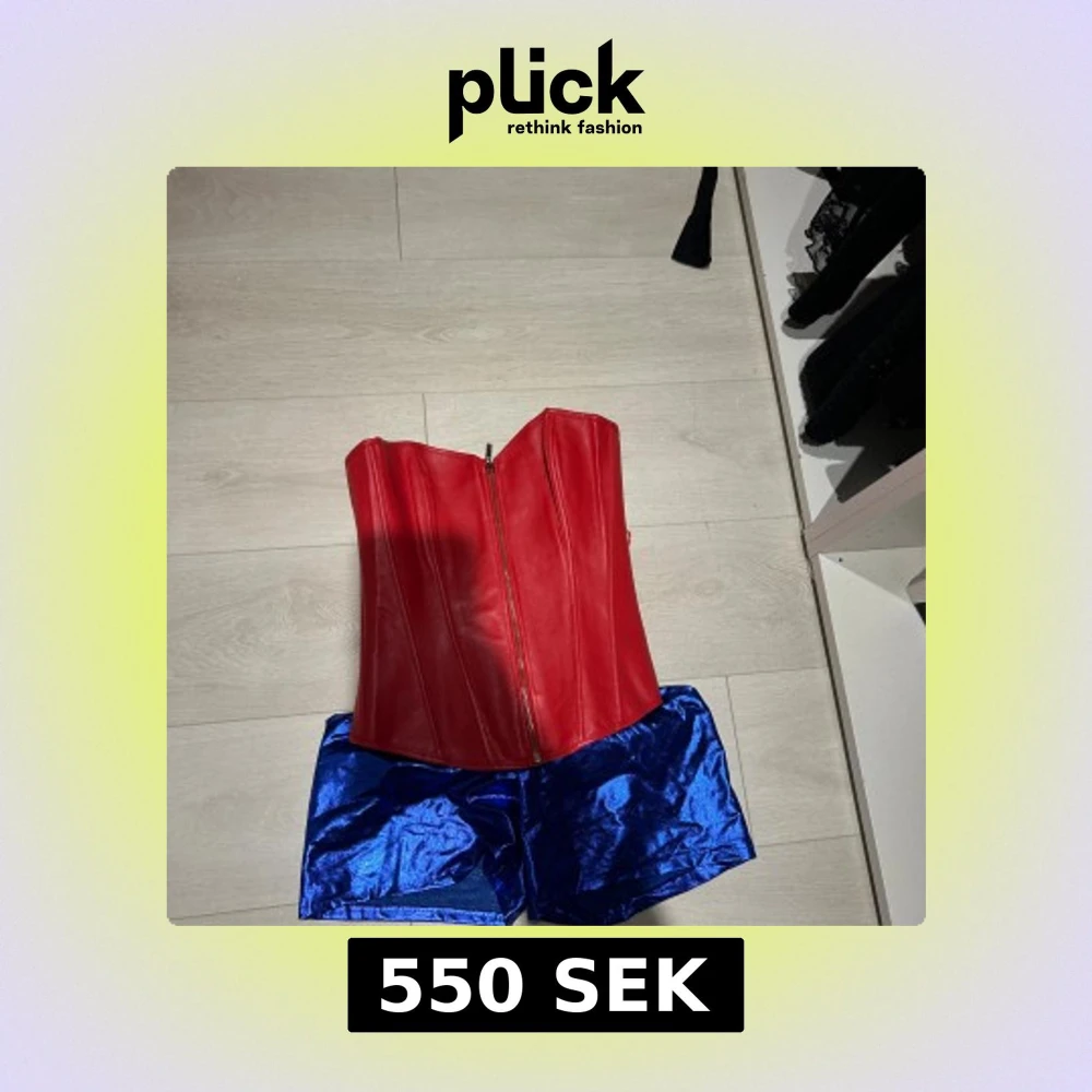 Säljer en snygg röd korsett i syntetmaterial med dragkedja framtill och snörning baktill. Korsetten har en stilren form med markerade sömmar och är axelbandslös. Perfekt för dig som vill sticka ut på festen eller cosplay.