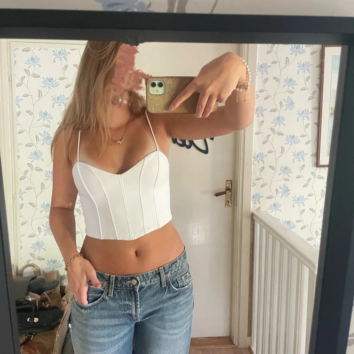 Supersnygg vit korsett-topp med smala axelband och markerade sömmar framtill. Toppen är croppad och har en stilren, figurnära passform som ger en trendig siluett. Perfekt att matcha med jeans eller vita byxor för en fräsch look.