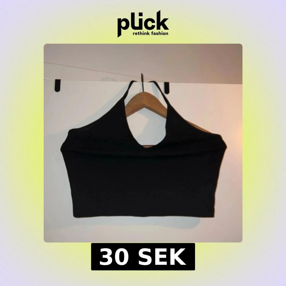 Snygg svart croppad tubtopp med halterneck och djup v-ringning. Rätt stor i storleken.