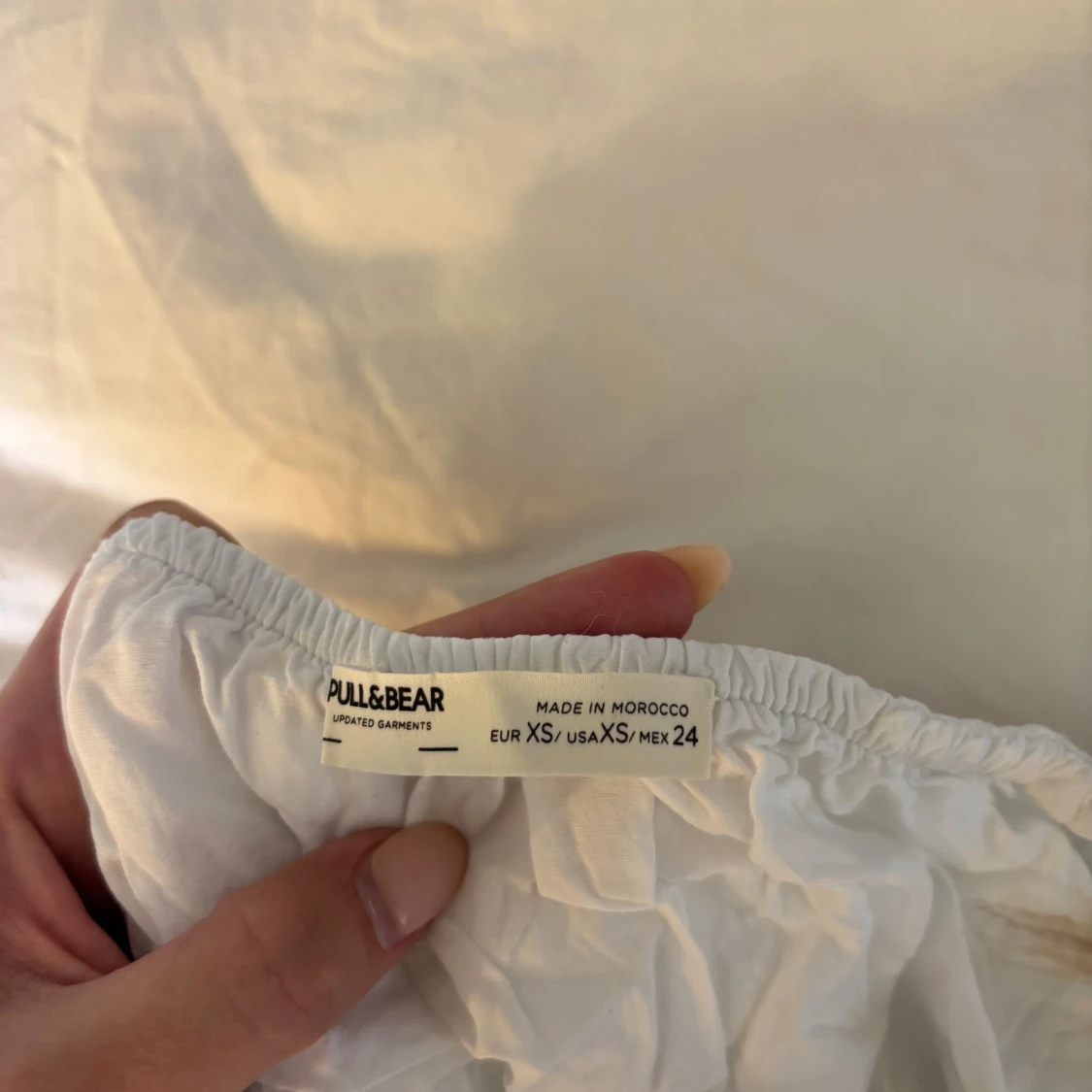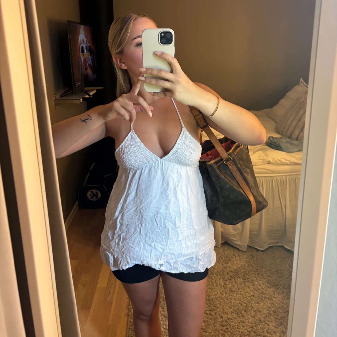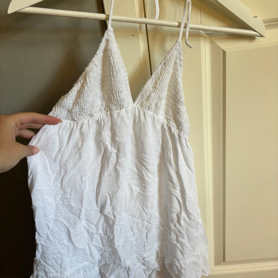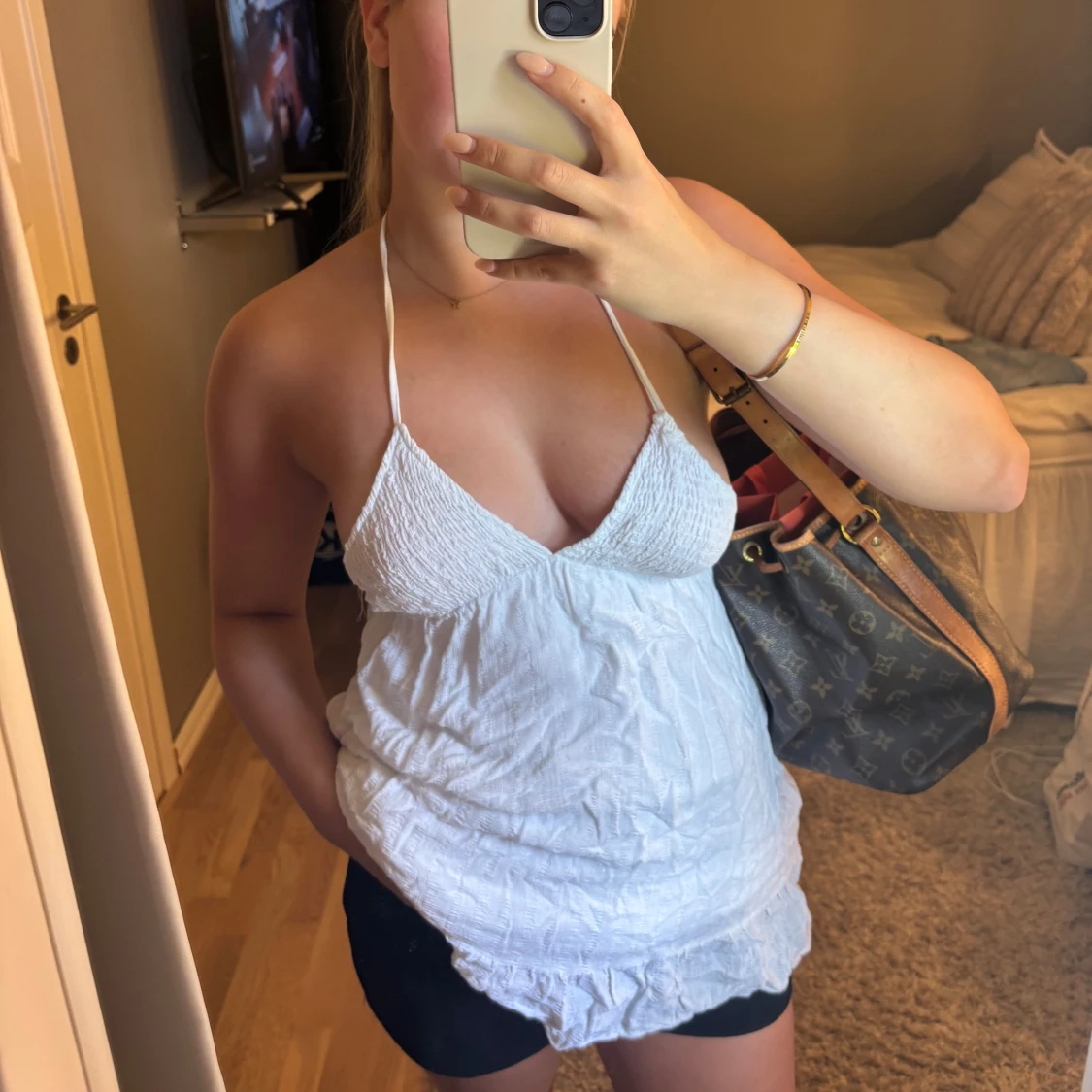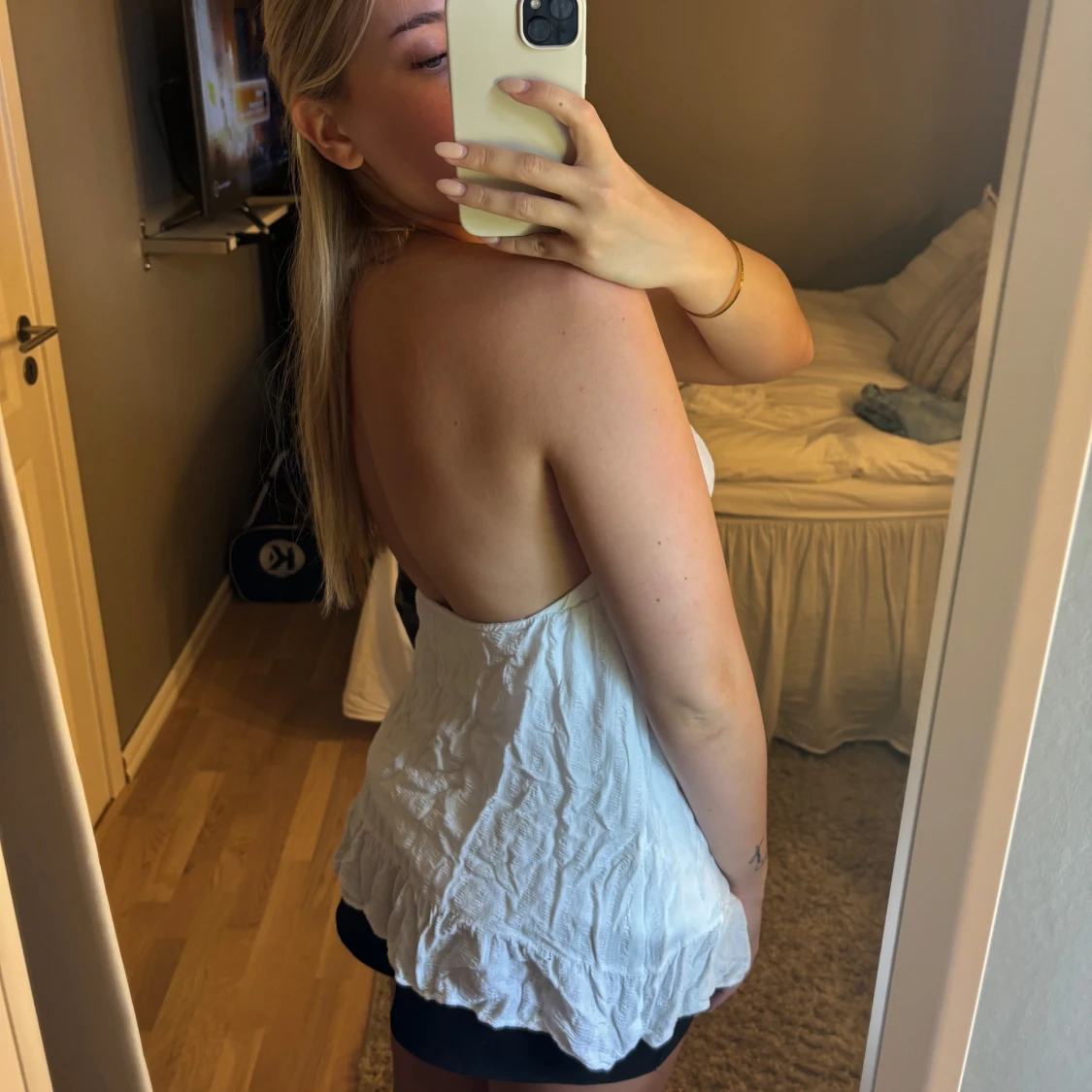 Supersöt vit linnetopp med smala halterneckband och v-ringad byst. Toppen är ärmlös och har en lätt rynkad struktur i tyget samt öppen rygg. Perfekt för varma dagar och ger en chill sommarkänsla. Den ser väldigt skrynklig ut på bilderna då jag inte använt den på ett tag, men det är bara att stryka 🥰