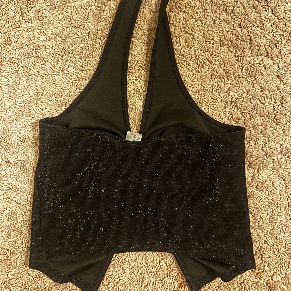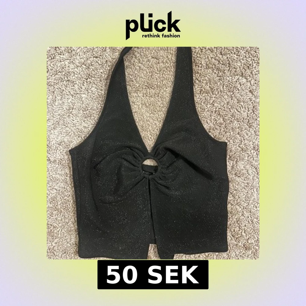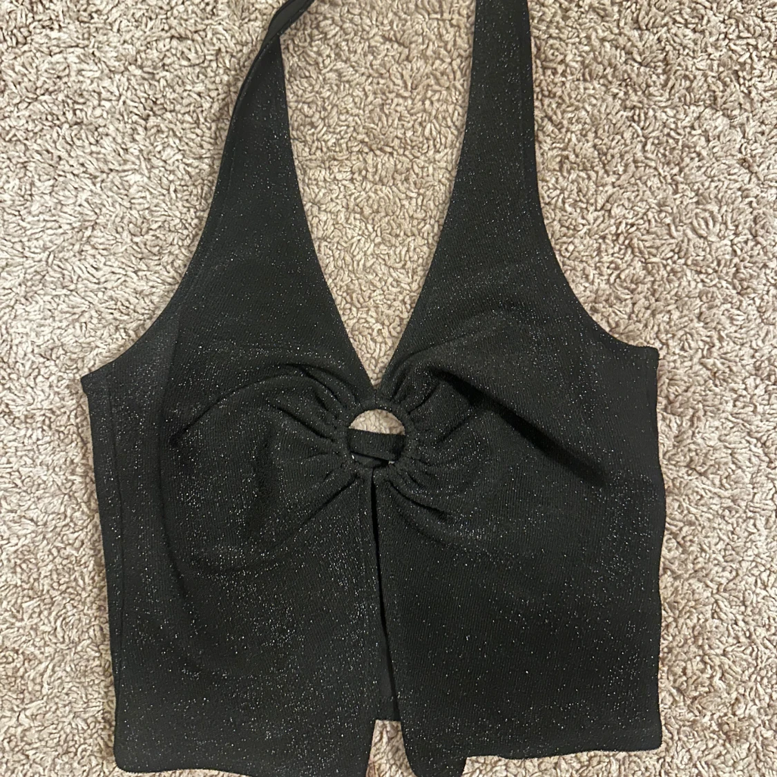Säljer denna topp då den inte används. Även denna är i nyskick. Den är svart och glittrig perfekt till fest. Den har en snygg detalj framtill, i form av en ring.
