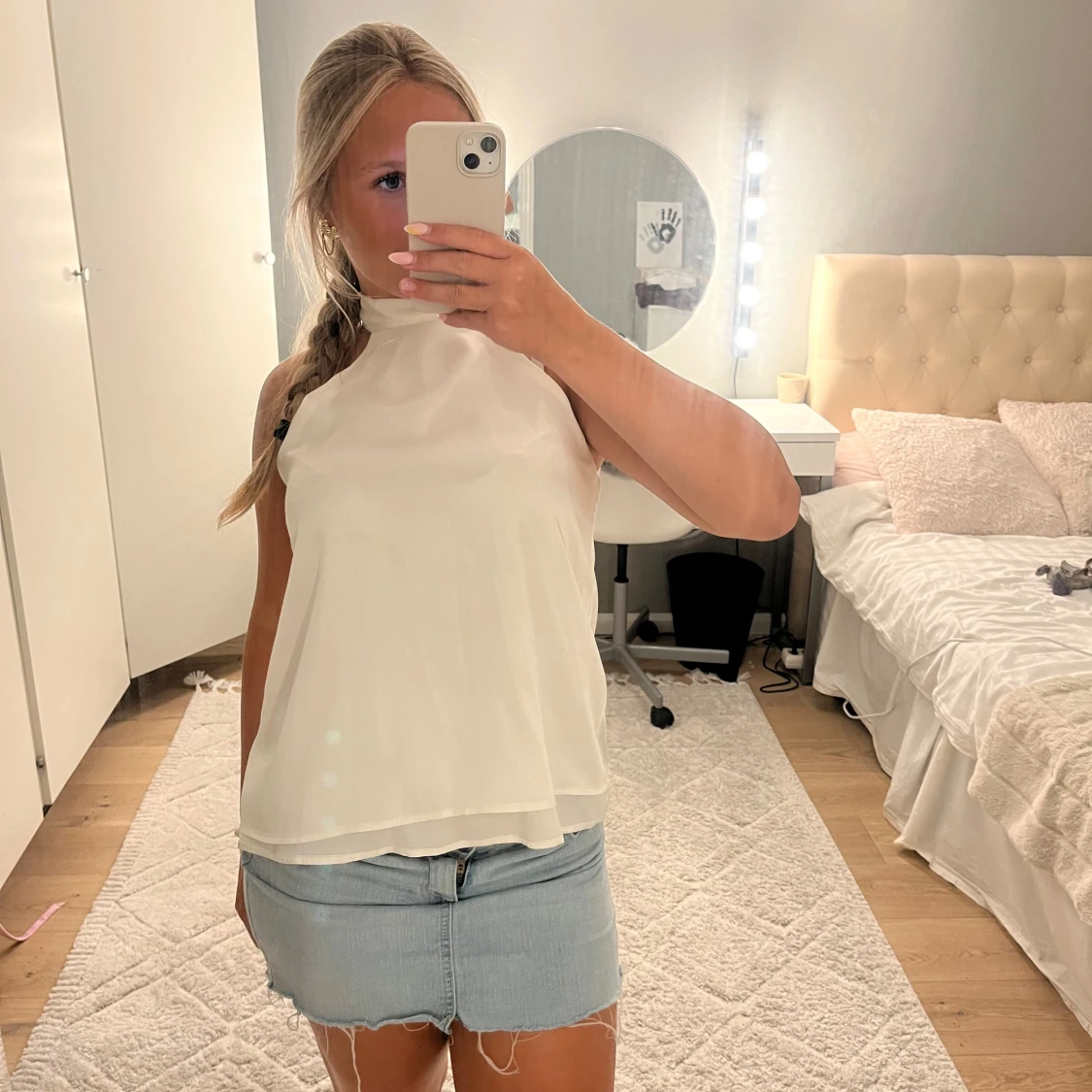 Säljer en flowy vit blus med hög hals och tunna axelband. Toppen är lätt och luftig med dubbla lager tyg som ger en snygg siluett. Perfekt till jeans eller kjol för en fräsch look. Passar dig som gillar stilrena och enkla plagg.