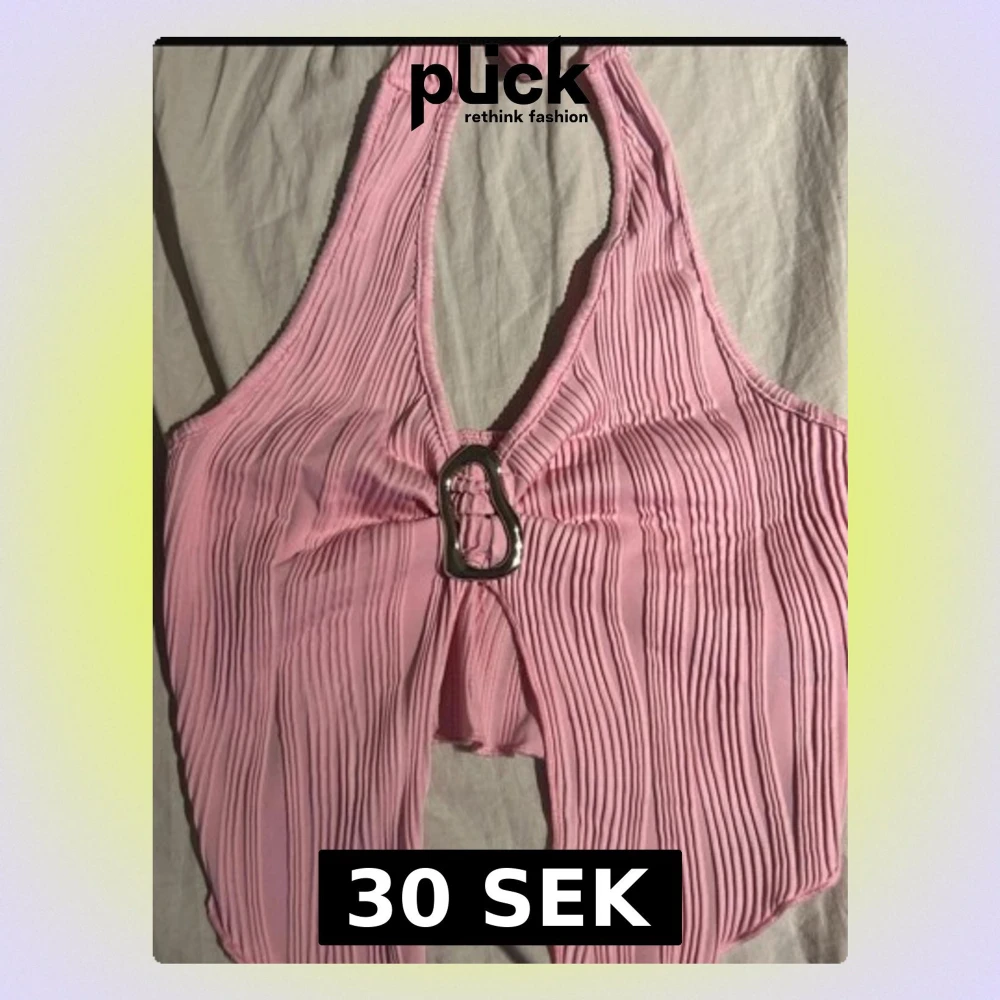 Ljusrosa ribbad halterneck-topp med öppen front och dekorativ metallring i mitten ger en snygg och edgy vibe. Croppad modell som framhäver midjan och passar perfekt till höga jeans eller kjol. En riktig statement-topp för fest eller sommarkvällar.(ifrån shein)
