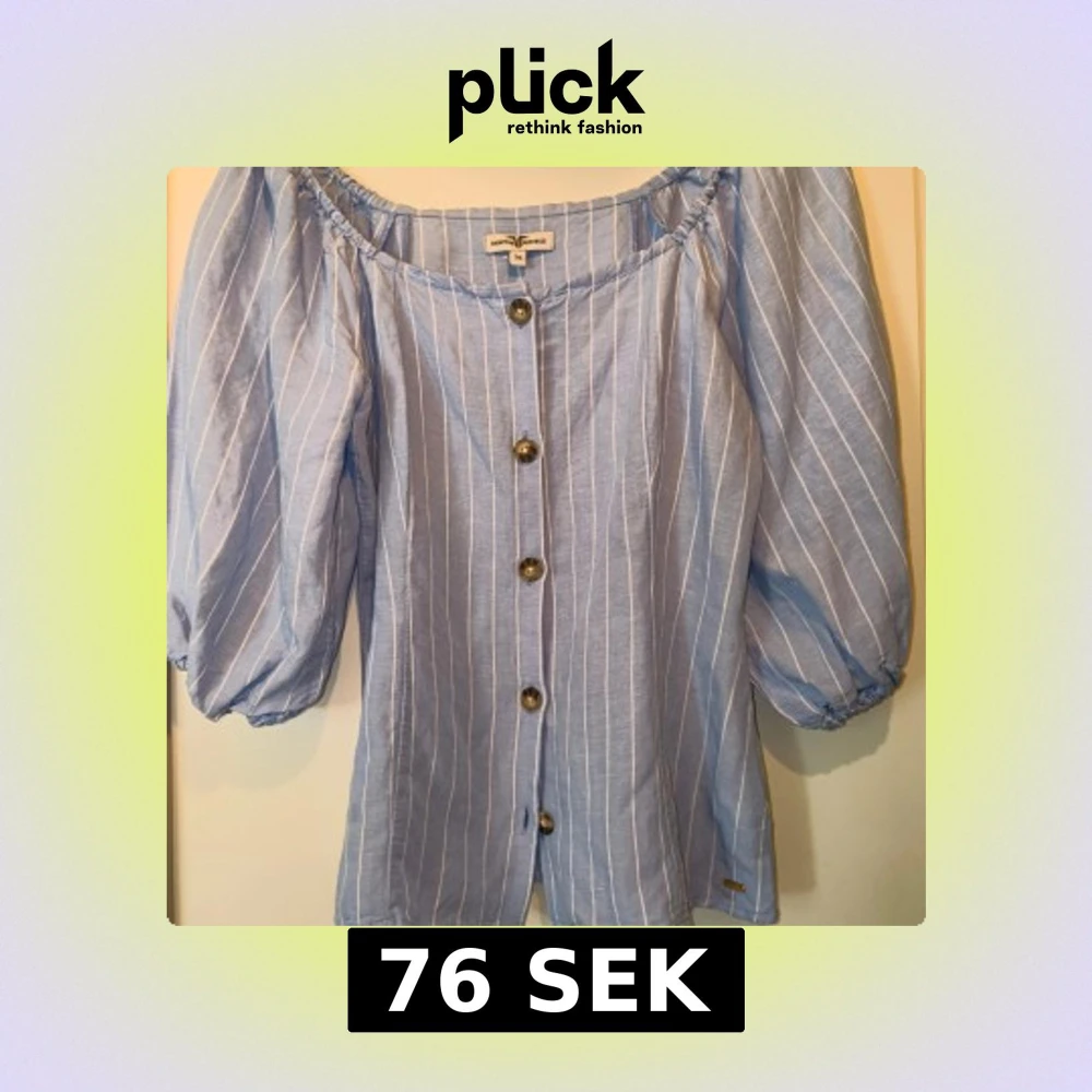 Säljer en ljusblå blus med vita ränder från Hampton Republic. Blusen har puffiga trekvartsärmar, knappar framtill och en offshoulder-design med resår vid halsen. Materialet är mjukt och luftigt, perfekt för varmare dagar. Superfin till jeans eller kjol!