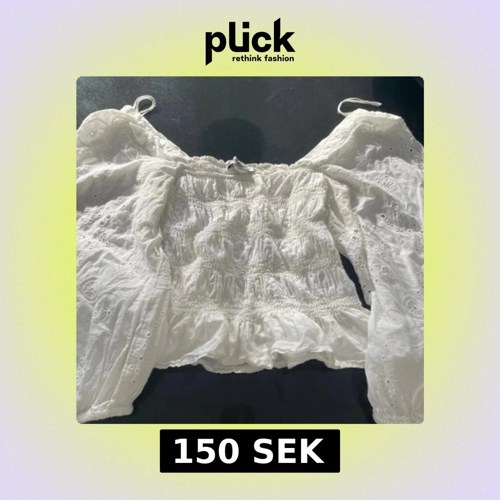 Supersöt vit blus från Hampton Rep i storlek XS. Blusen har smockad kropp, vida puffärmar och broderade detaljer med hålmönster. Offshoulder-modell med resår upptill och nertill på ärmarna. Perfekt för en somrig look!