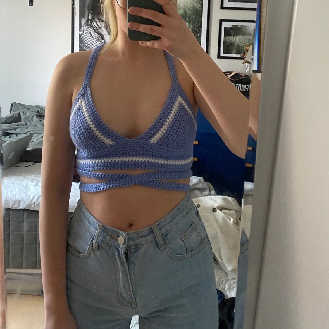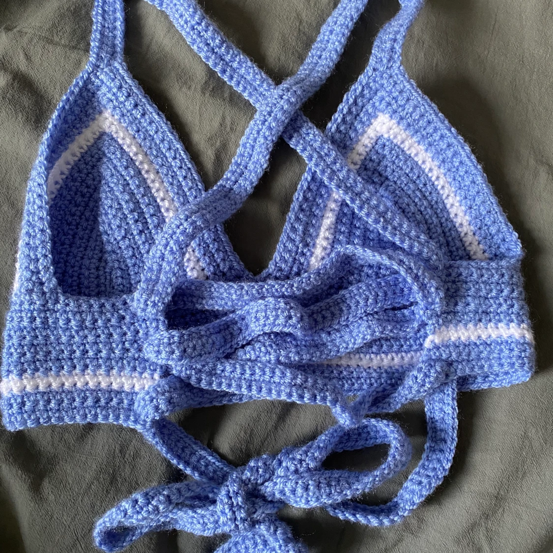 Egengjord virkad topp, blå med vita detaljer. Har extra långt band som kan knytas som man själv önskar (exempel på bilden). Kupa A/B, bandet är justerbart.💖 Kan göras i fler färger och storlekar