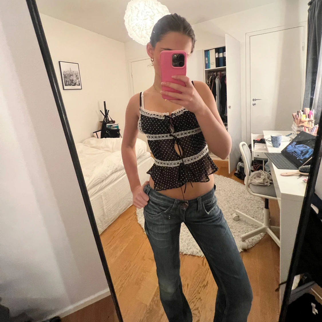 Svart och vit prickig topp från urban outfitters med spetsdetaljer och knytning framtill. Använd 1 gång