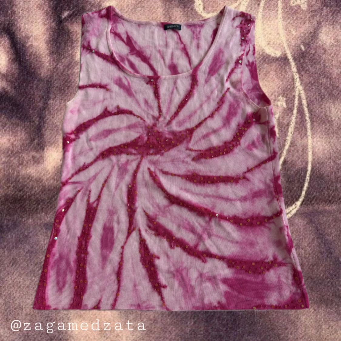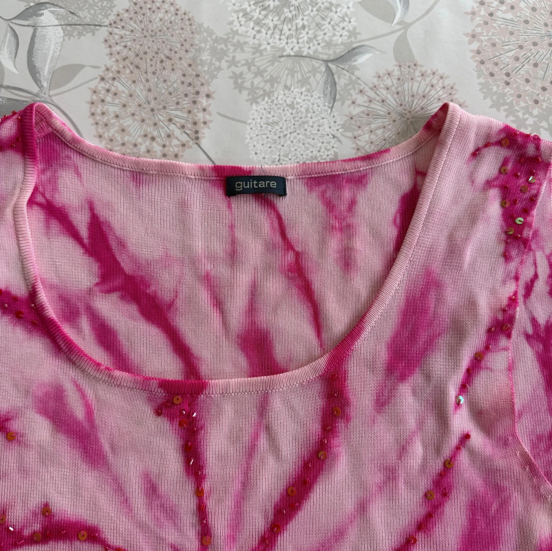 Supersnygg ärmlös linne-topp från Guitare i rosa och cerise tie-dye mönster. Toppen har paljettdetaljer som glittrar och ger extra wow-känsla. Perfekt för dig som vill sticka ut med färg och mönster. Mjuk och skön bomullskänsla.