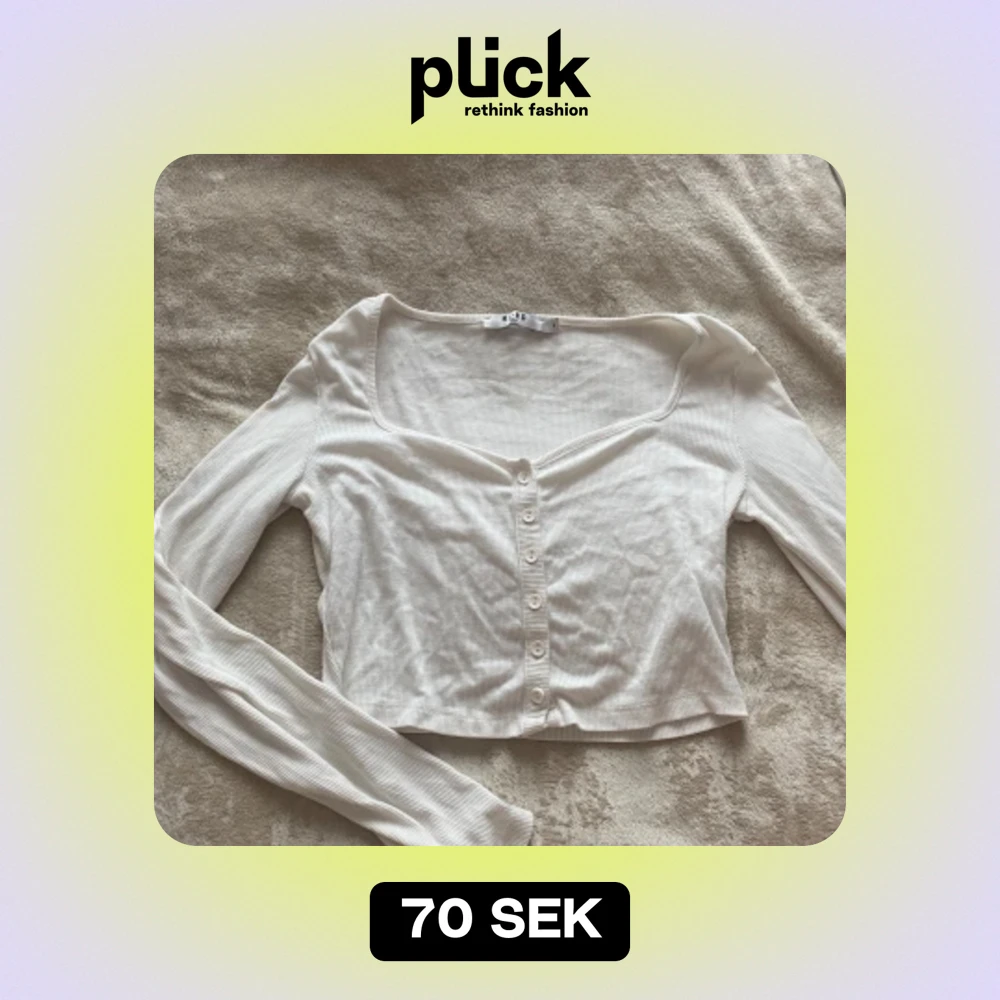 Långärmad, cropped, hjärtformad topp som även kan användas som kofta. Tunt material i en kall vit färg. Är i storlek 36 men passar även en 38 pga det stretchiga materialet.