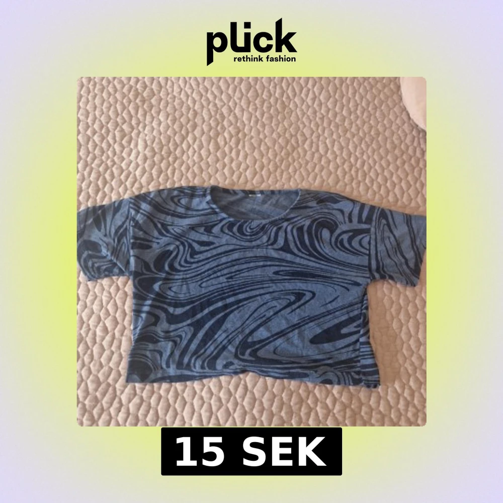 Säljer en blå croppad topp med ett unikt abstrakt mönster i mörkare nyanser. Toppen har korta ärmar och en rund halsringning, perfekt för en avslappnad stil.