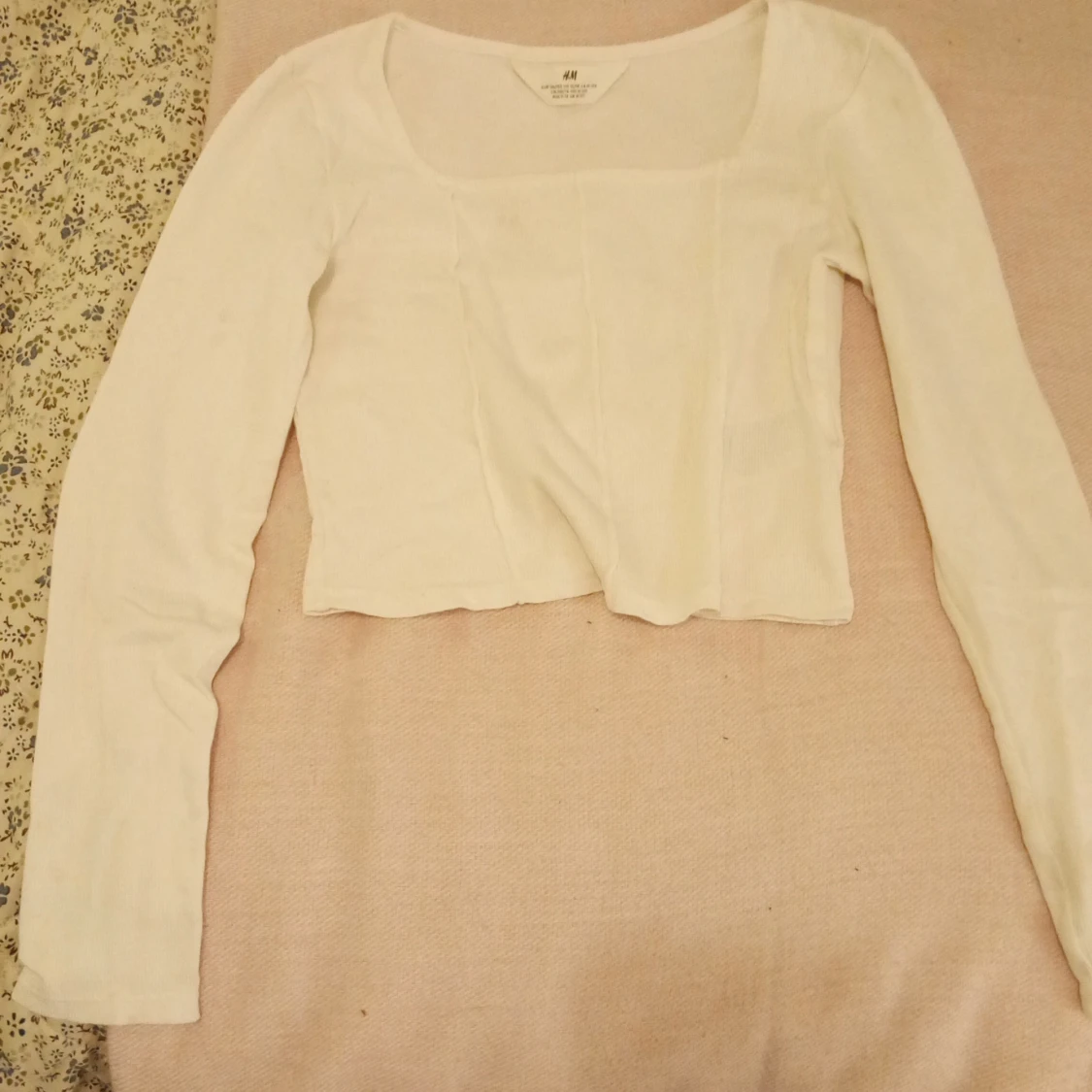 Säljer en stilren vit ribbad topp från H&M. Toppen har en tight passform med långa ärmar och en fyrkantig halsringning. Perfekt för lager-på-lager eller som den är. Hör av dig vid intresse!
