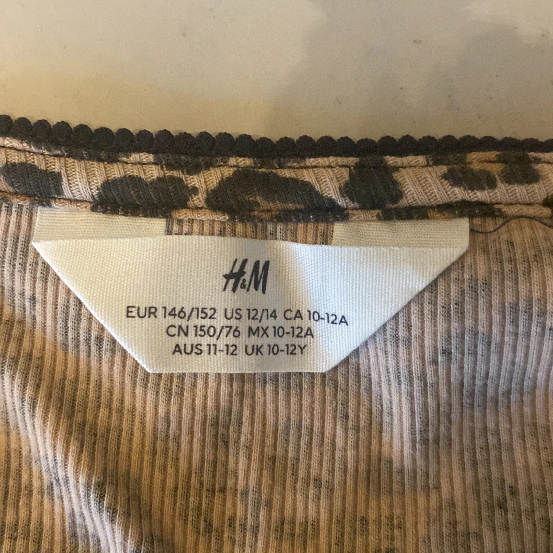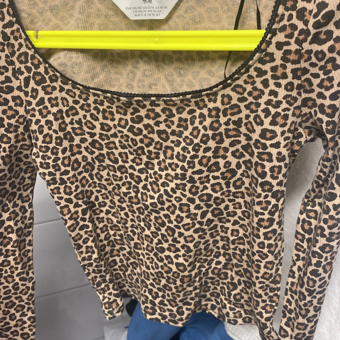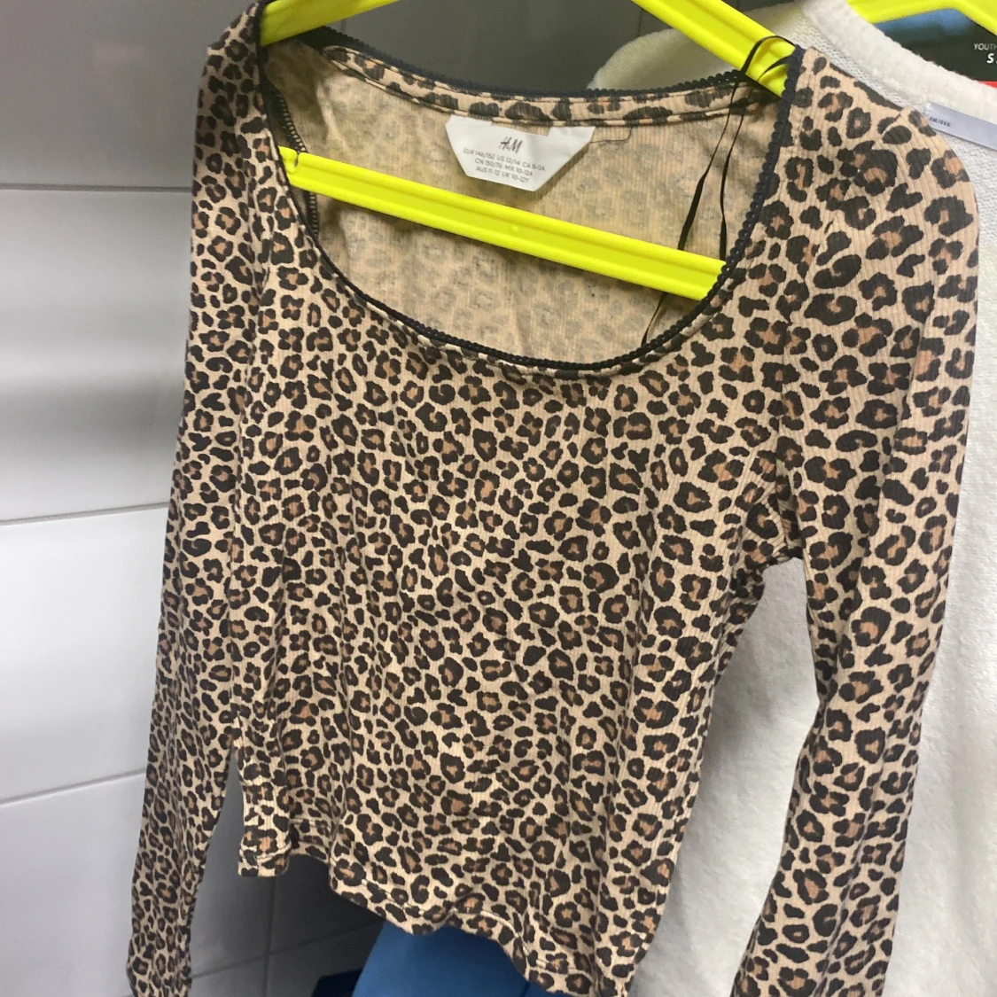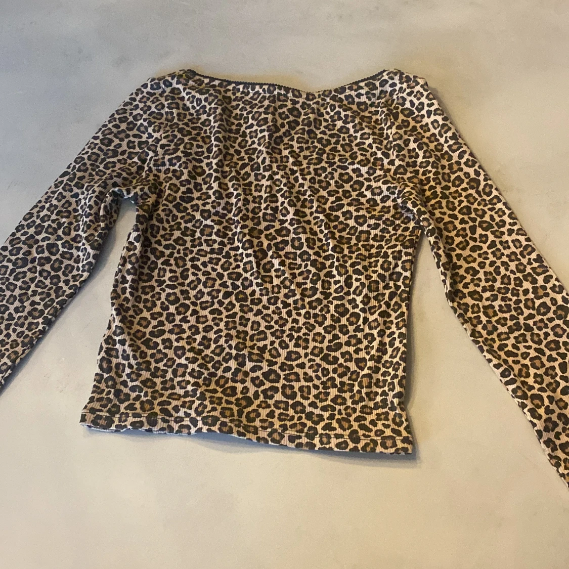 Snygg långärmad topp från H&M med leopardmönster i beige och bruna toner. Modellen har rundad urringning med svart kant och är tillverkad i ett mjukt, stretchigt material som sitter skönt på kroppen. Perfekt för dig som vill sticka ut med ett djurmönster.