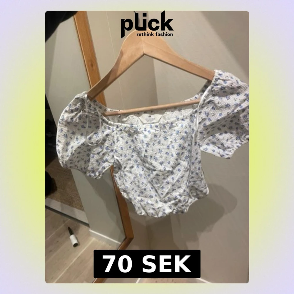 Supersöt offshoulder topp från H&M med puffärmar och croppad passform. Vit botten med små blå blommor över hela tyget. Tillverkad i ett lätt och luftigt material, perfekt för varma dagar. Passar dig som gillar romantisk och trendig stil.