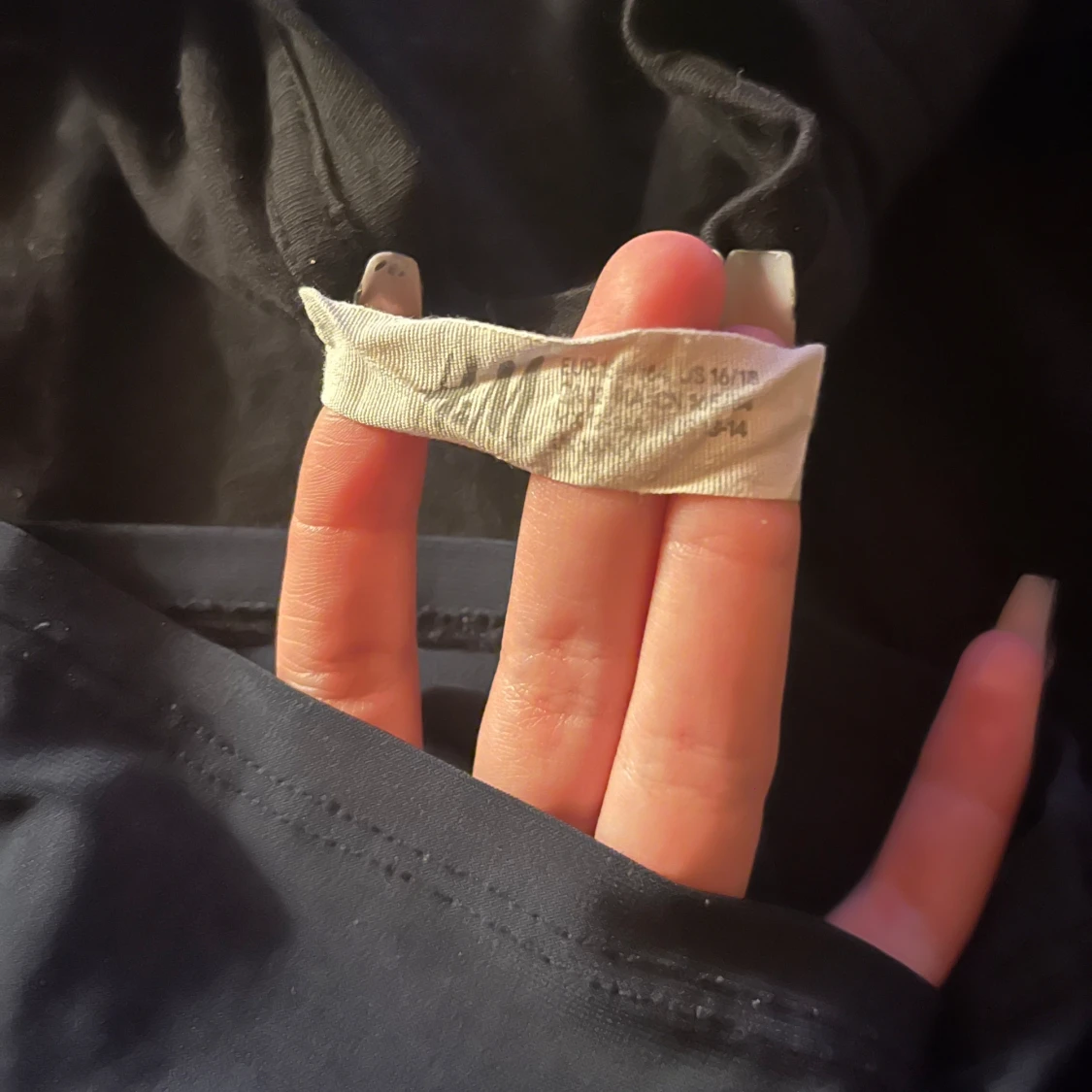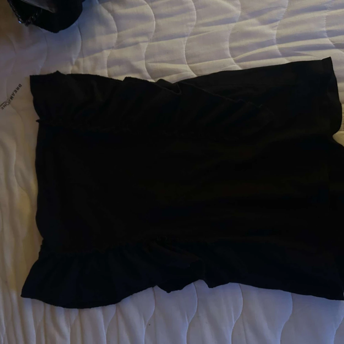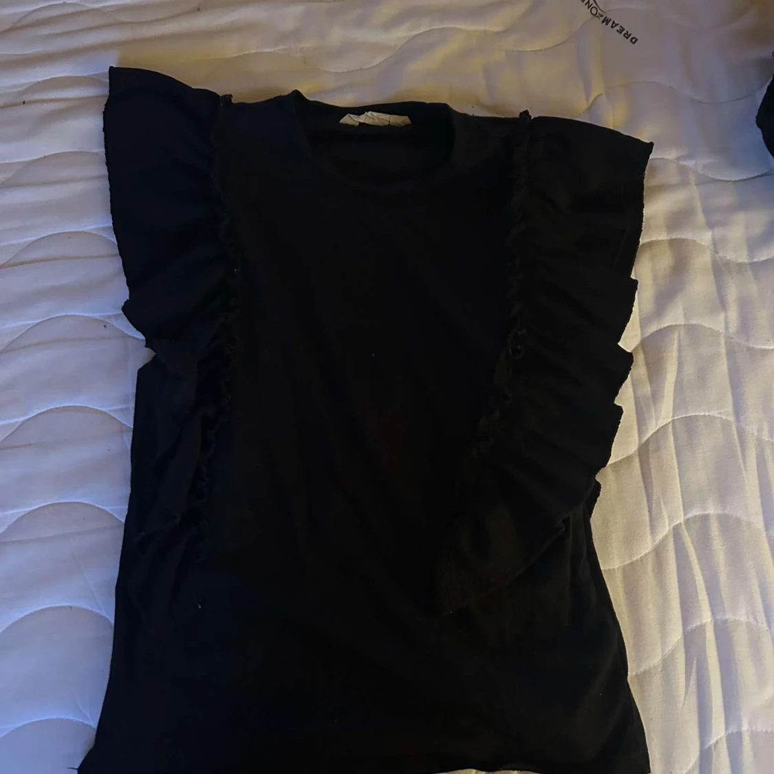 Svart topp från H&M med breda volangdetaljer längs axlarna och ärmarna. T-shirten har rund halsringning och är tillverkad i mjukt material som känns skönt mot huden. Perfekt för dig som vill ha en basic topp med extra edge.
