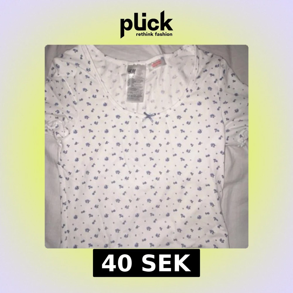 Söt vit pyjamas topp med små blå blommor över hela. Rund halsringning och en liten blå rosett framtill. Toppen har korta ärmar med lätt rynk vid axlarna.
