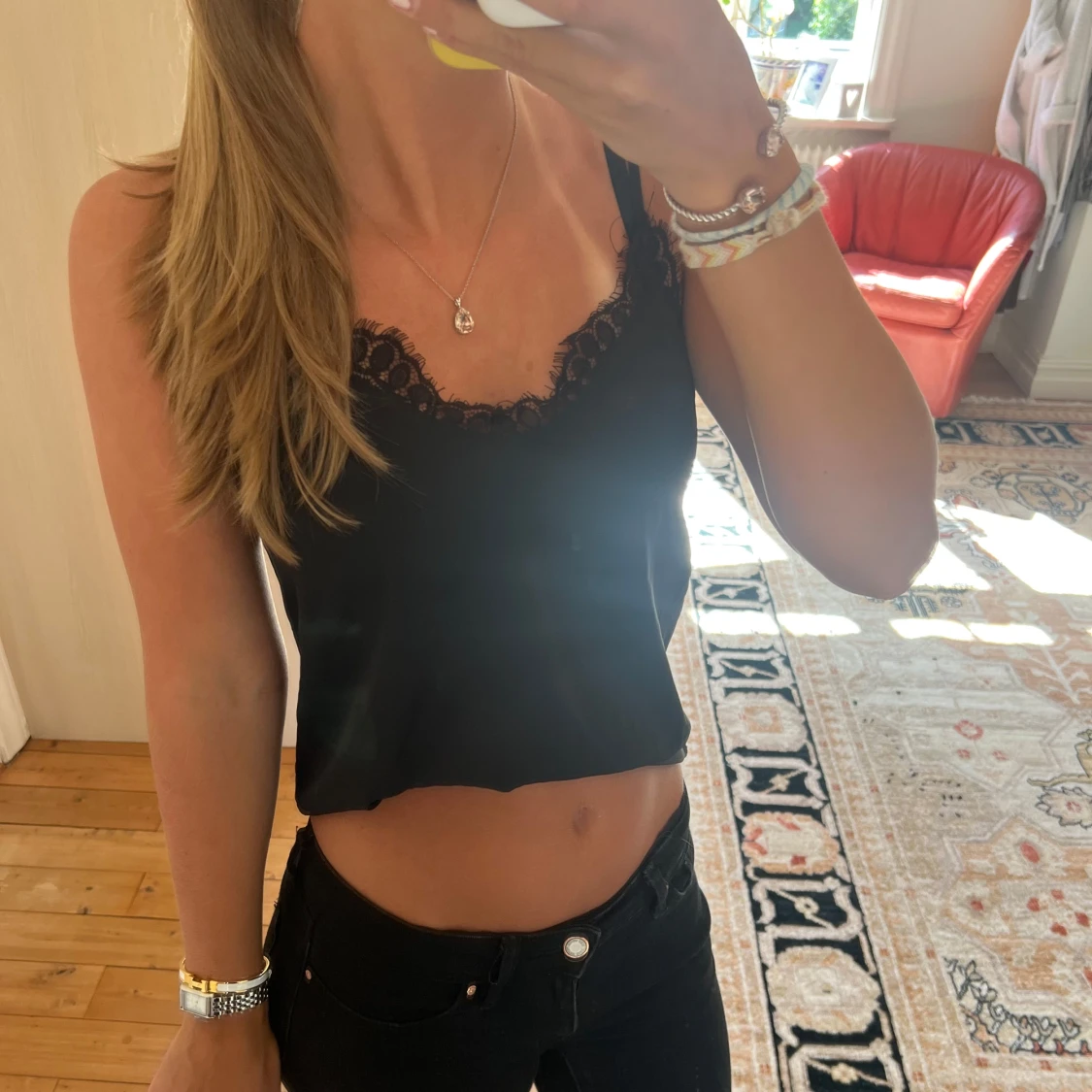 Säljer en svart linnetopp med tunna axelband och snygg spetskant längs urringningen. Toppen är croppad och har en enkel, stilren look som passar perfekt till jeans eller kjol. Materialet känns mjukt och lätt mot huden.