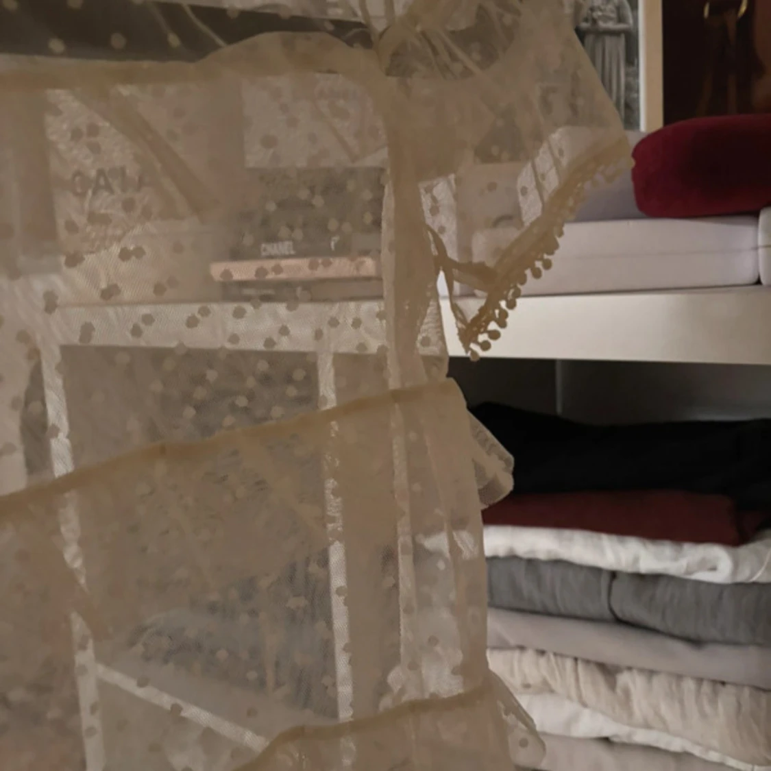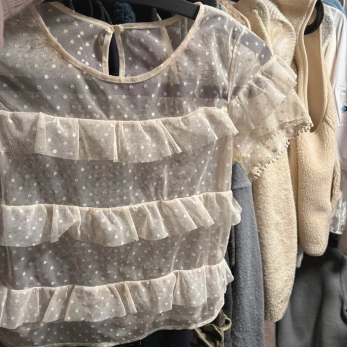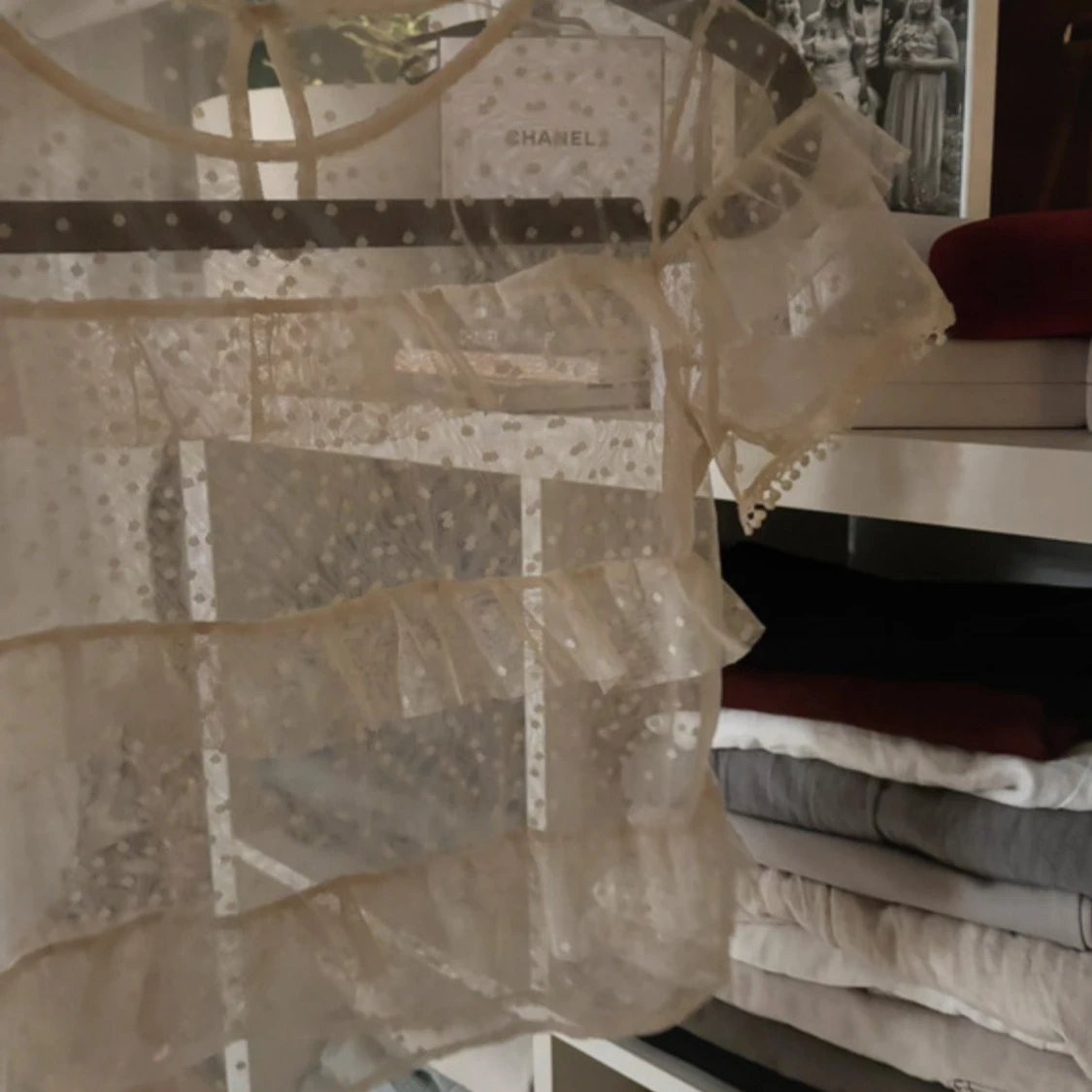 Säljer en transparent beige blus med prickigt mönster och flera lager volanger framtill. Blusen har korta ärmar med små bollar vid kanten och en rund hals med knapp i nacken. Perfekt för dig som gillar romantisk och lekfull stil.