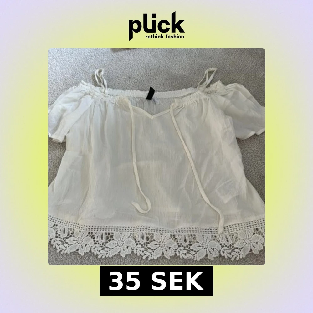 Säljer en söt vit blus från H&M med tunna axelband och offshoulder-design. Blusen har knytband framtill och vacker spetskant nertill med blommönster. Perfekt för varma dagar och somriga outfits!