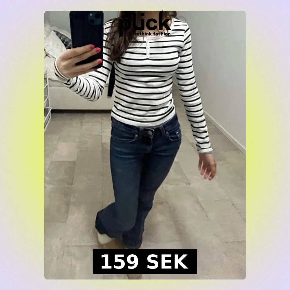 ALDRIG HAFT! Säljer en vit långärmad topp från H&M med svarta horisontella ränder. Toppen har en rund halsringning och små knappar framtill. Materialet är mjukt och stretchigt, troligtvis bomull eller en bomullsblandning. Perfekt till jeans eller kjol!