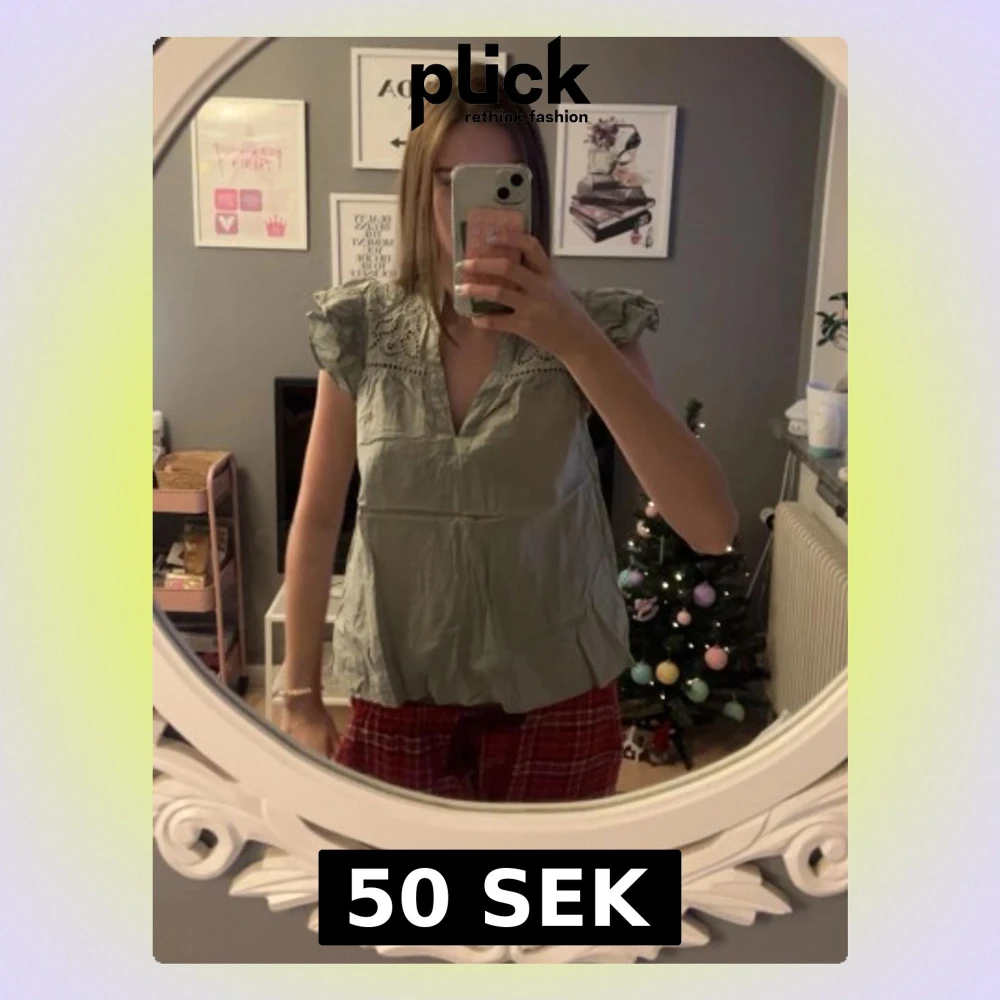 Säljer en ljusgrön blus med volangärmar och v-ringning. Blusen har fina spetsdetaljer. Perfekt för dig som gillar romantiska och luftiga plagg.