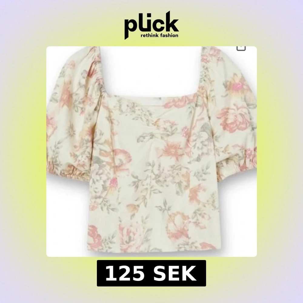 Supersöt topp från H&M i linnemix med blommigt mönster i ljusa toner av rosa, beige och grön. Modellen har puffiga korta ärmar, fyrkantig ringning och smickrande passform💕
