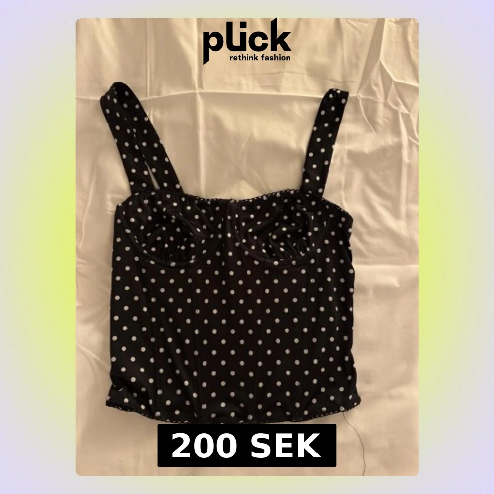 Säljer en svart korsett med vita prickar och breda axelband. Toppen har markerade kupor och en dragkedja i ryggen. Materialet är mjukt och följsamt, troligen polyester. Perfekt för dig som gillar retrovibbar och vill sticka ut med ett coolt mönster.