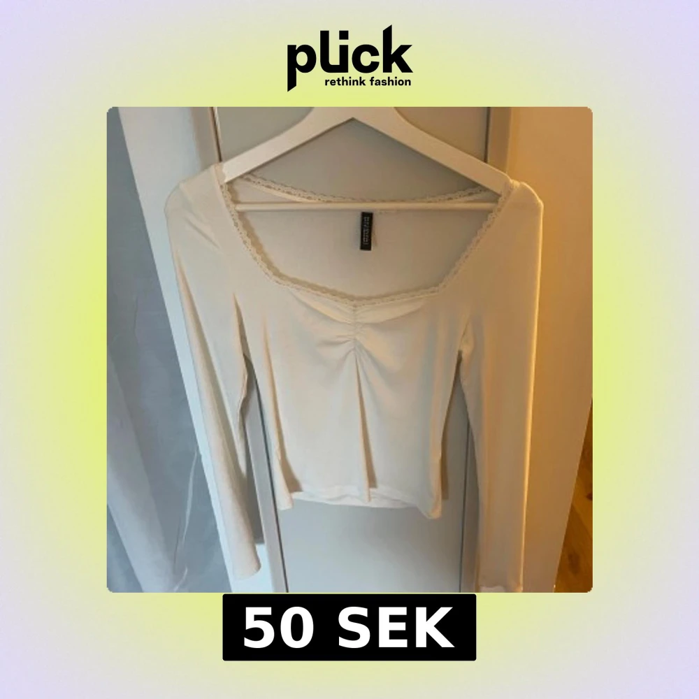Säljer en söt vit långärmad topp från h&m med spetskant runt den fyrkantiga ringningen och lätt rynk framtill. Toppen är i mjuk ribbad bomull och har en feminin och enkel stil som passar perfekt till jeans eller kjol.