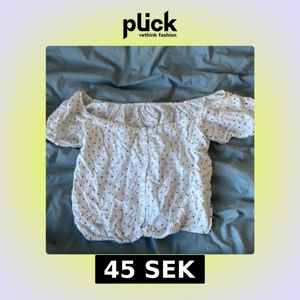 Charmig vit offshoulder blus med små svarta prickar och korta puffärmar. Perfekt för en somrig look med elastiska kanter för en bekväm passform.
