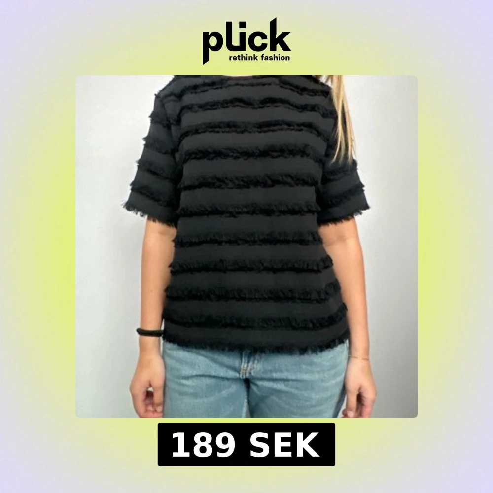 Säljer en svart topp med horisontella ränder i ett texturerat material. Toppen har korta ärmar och en normal passform, perfekt för en stilren look.