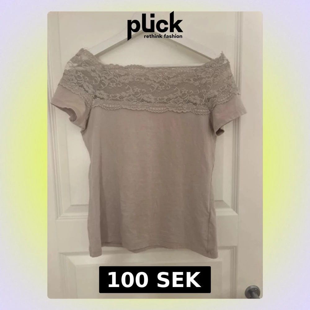 Söt beige offshoulder topp med bred spetsdetalj över axlarna. Toppen har korta ärmar och är tillverkad i mjukt material som känns skönt mot huden.