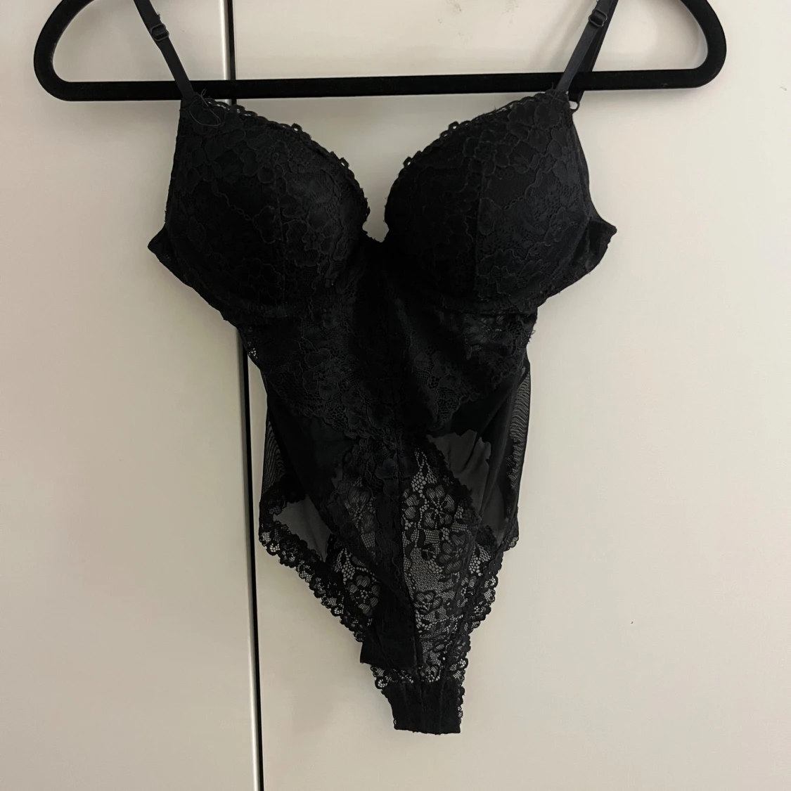 Säljer en svart body från H&M i storlek 36. Den har genomskinliga meshpartier och detaljerad spets framtill och upptill, med vadderade kupor och justerbara axelband. Snygg och tight passform som ger en riktigt cool siluett.