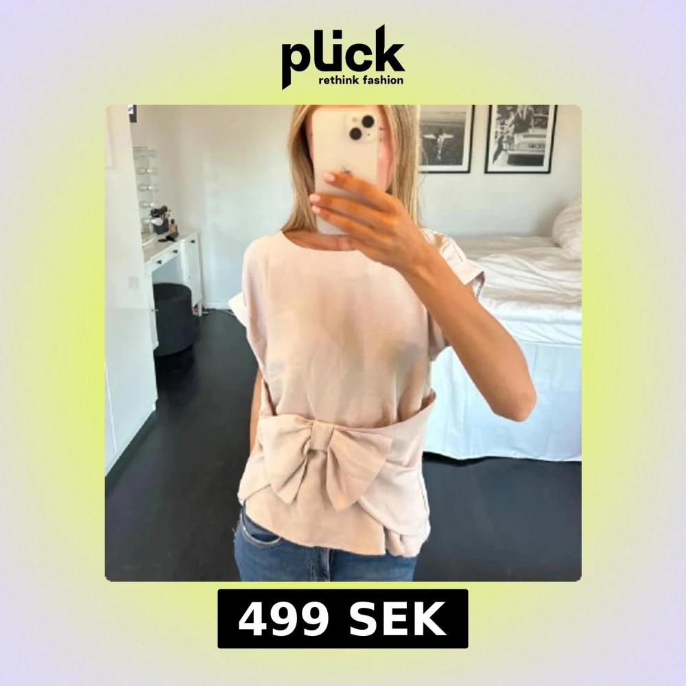 Säljer en beige blus från H&M med korta ärmar och en stor rosett framtill i midjan. Blusen har en lätt strukturerad yta och rund halsringning. Perfekt för dig som gillar feminina detaljer och en stilren look.