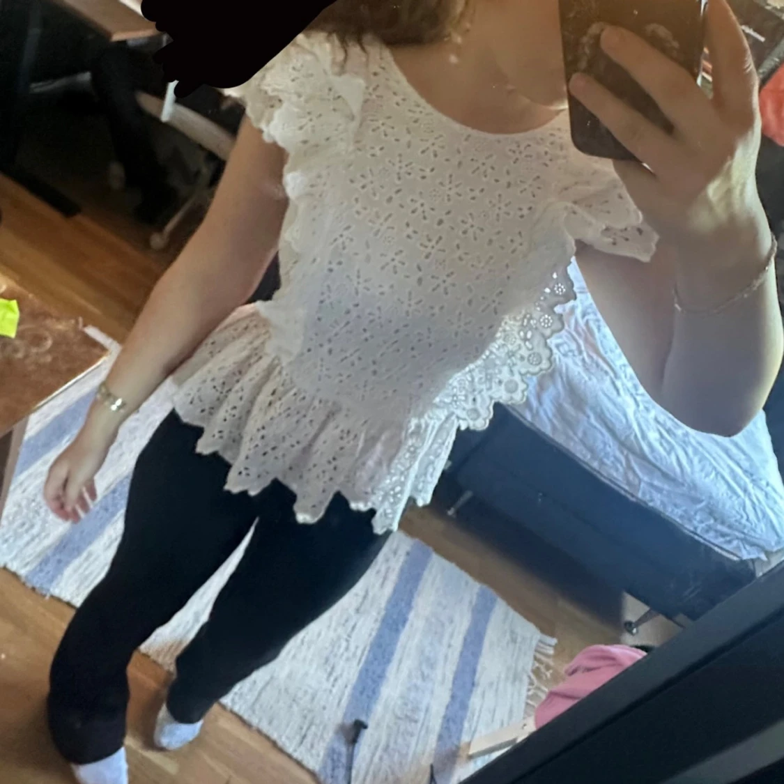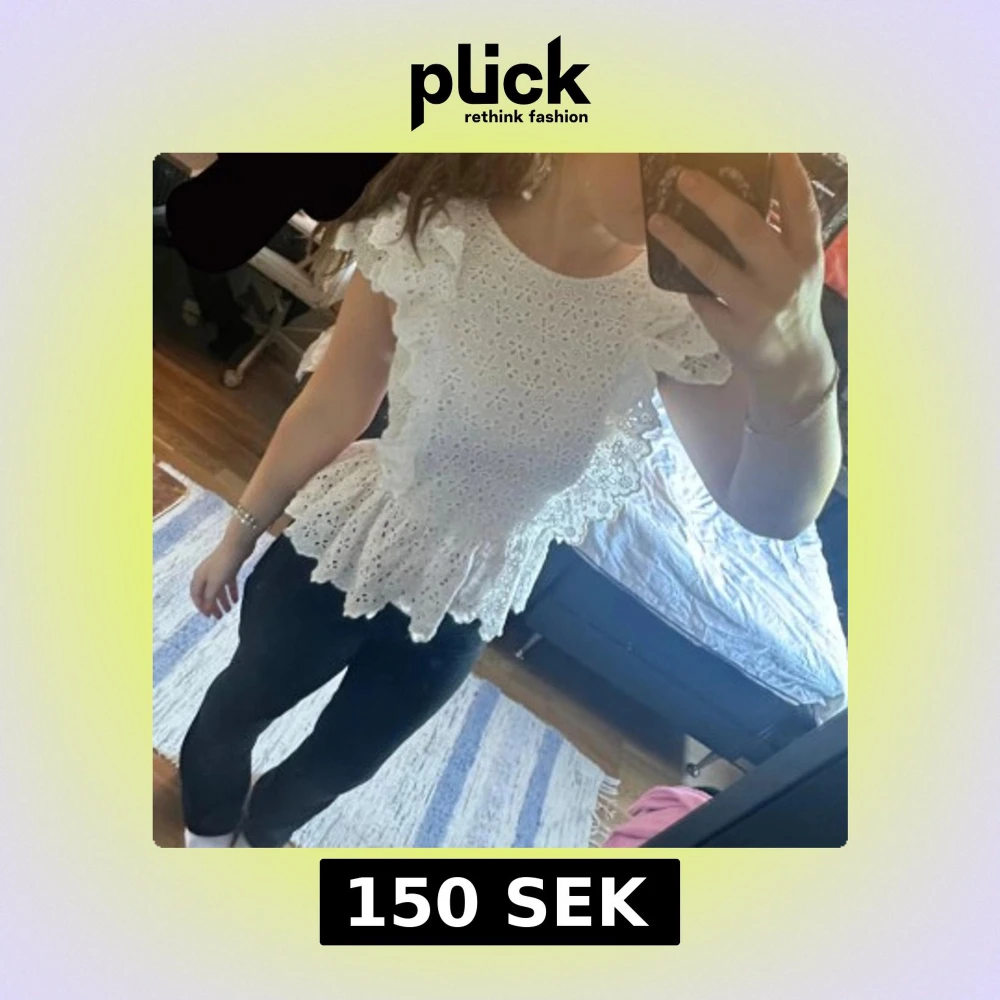 vit blus med broderade blommor och volangdetaljer vid axlar och nederkant. 💕