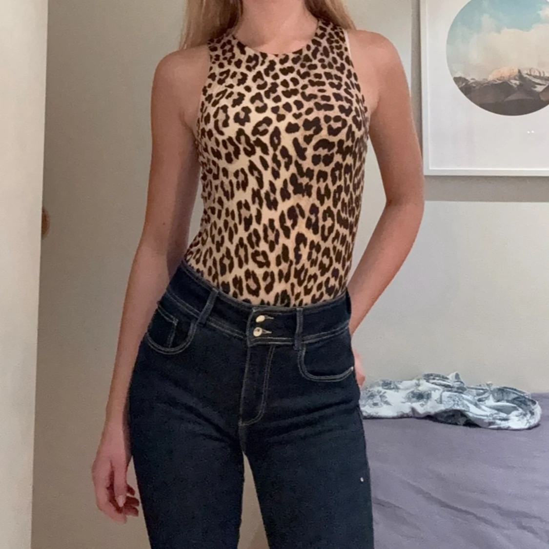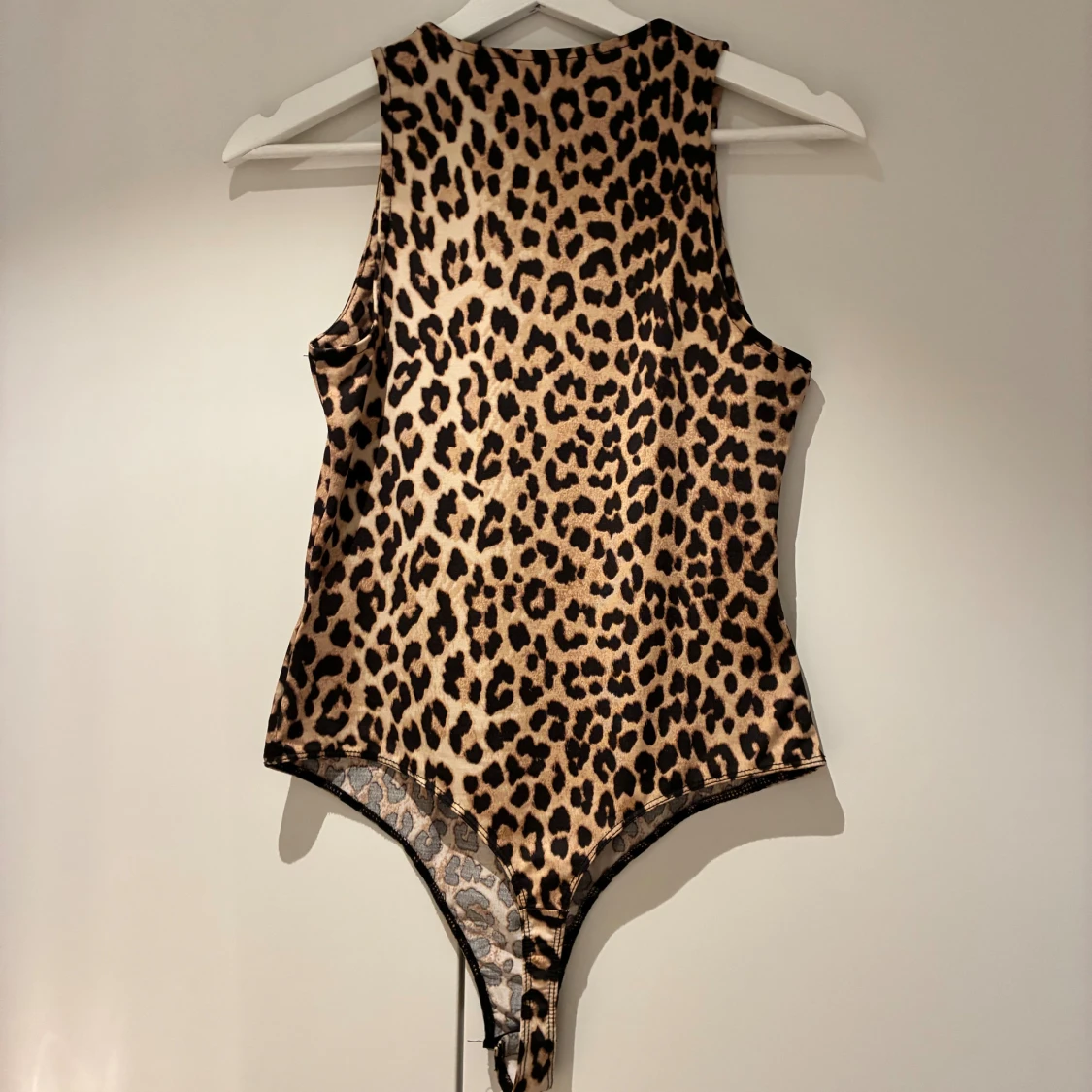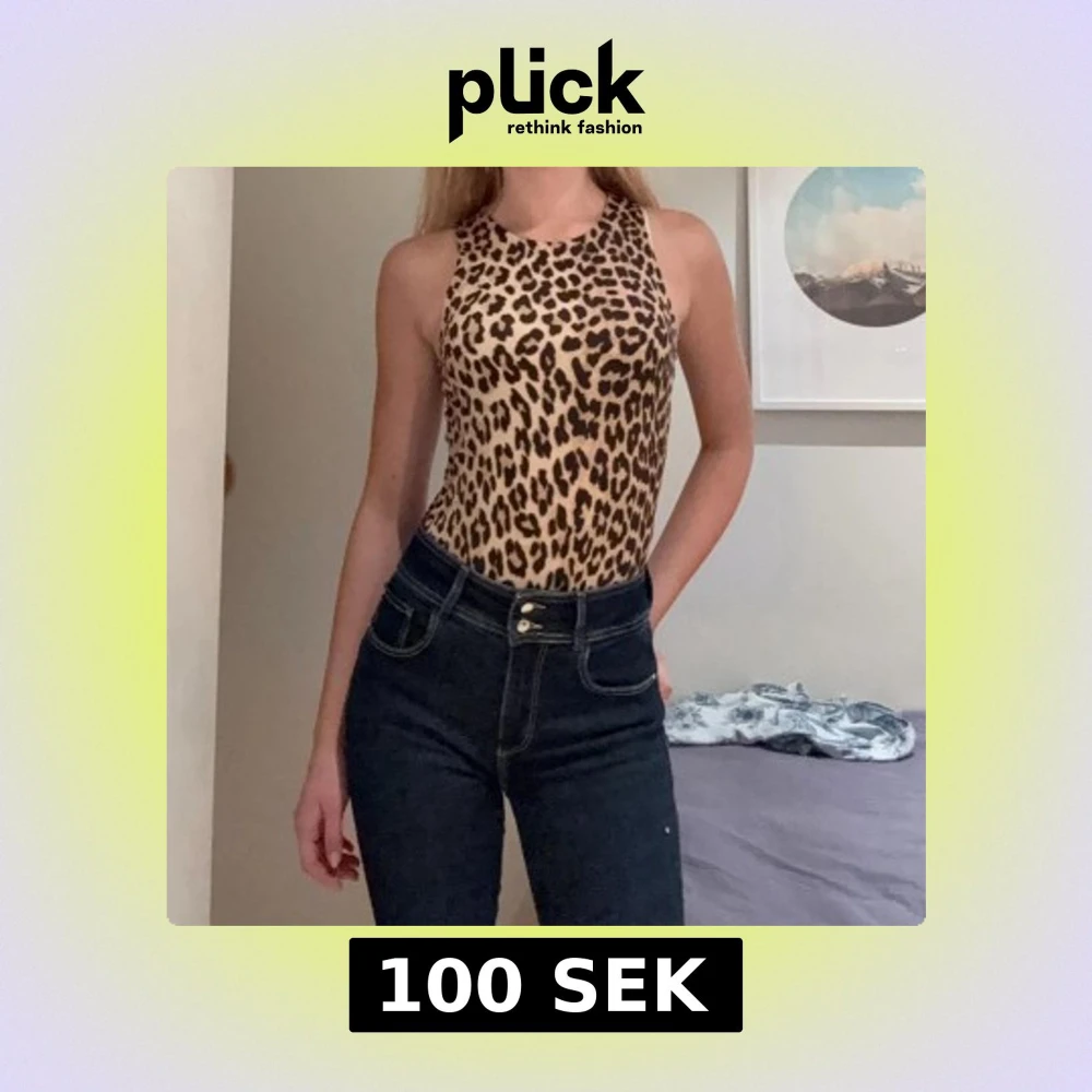 Säljer en snygg ärmlös body med leopardmönster i beige och svart. Toppen har rund halsringning och är figurnära med stretchigt material, perfekt att styla med jeans eller kjol för en cool look.