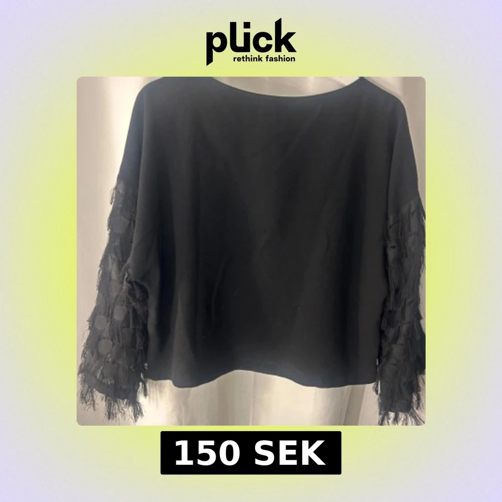 Svart blus från H&M i storlek 36 med vida, fransiga ärmar som har ett coolt mönster av cirklar och fransdetaljer. Toppen har en rak, croppad passform och rund halsringning. Perfekt för dig som vill ha något unikt och trendigt i garderoben.