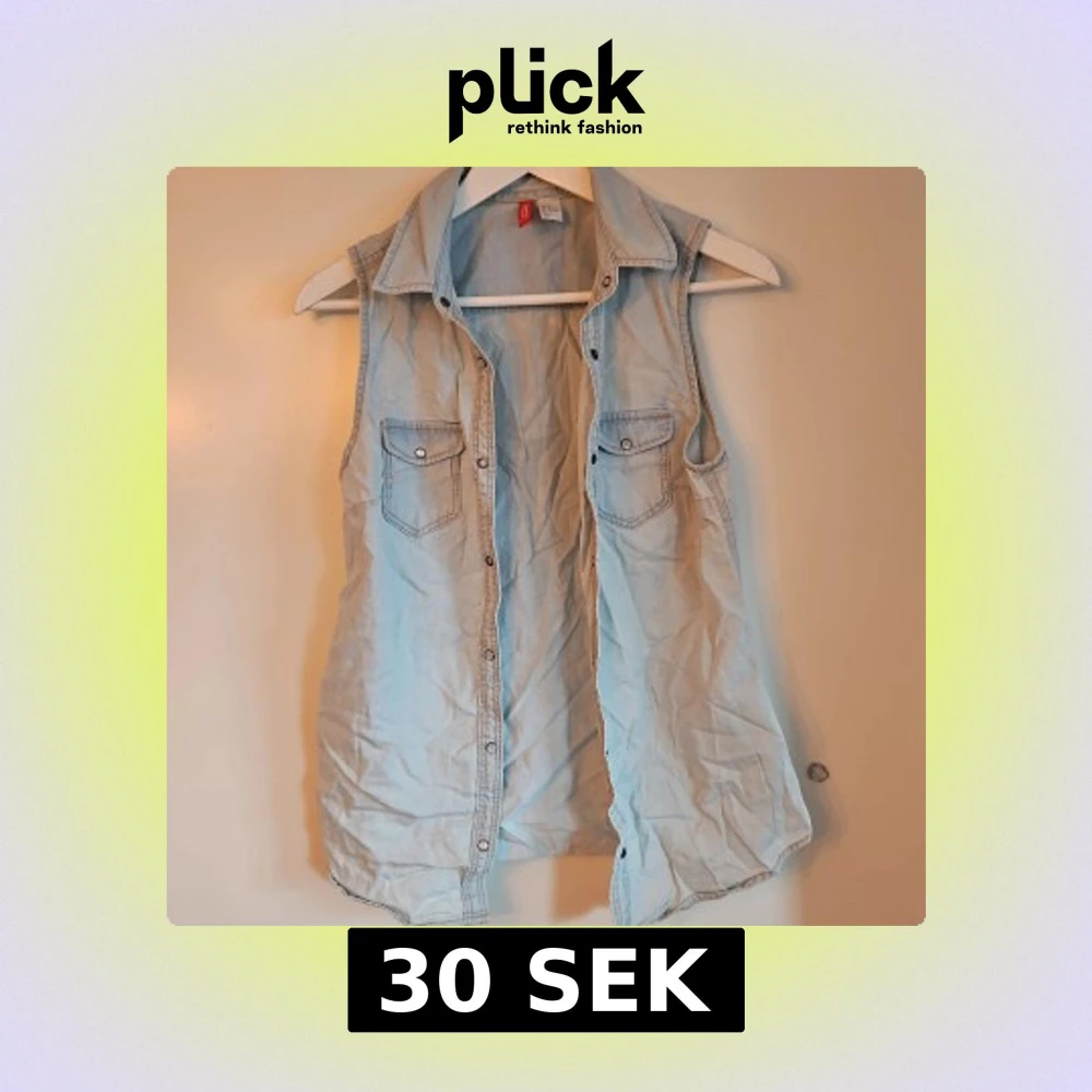 Säljer en ljusblå jeansväst från H&M med knappar framtill och två bröstfickor. Västen har en klassisk krage och är ärmlös, perfekt för en avslappnad stil.