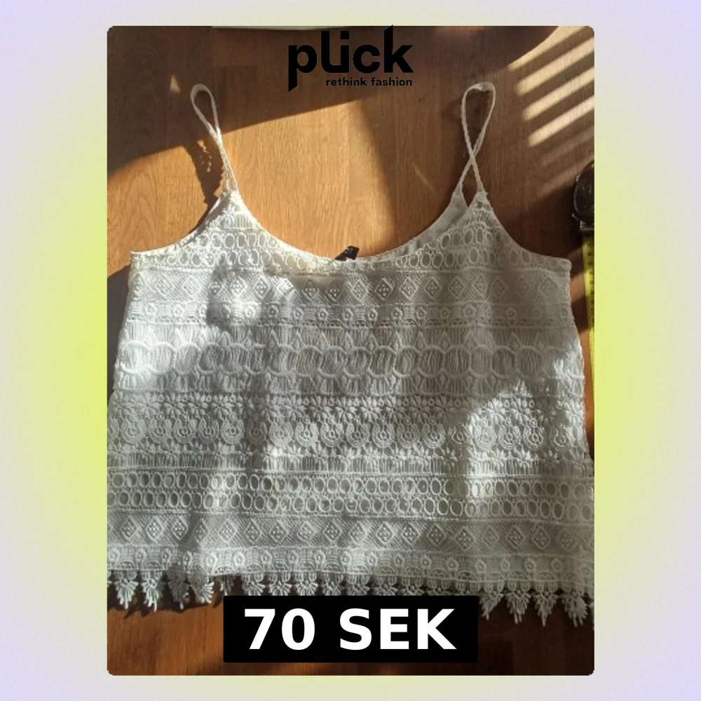 Fin vit topp med tunna axelband och spets. Den har ett fint mönster och en dekorativ kant längst ner. Använd få gånger. Perfekt till sommaren och lätt att matcha med jeans eller kjol.
