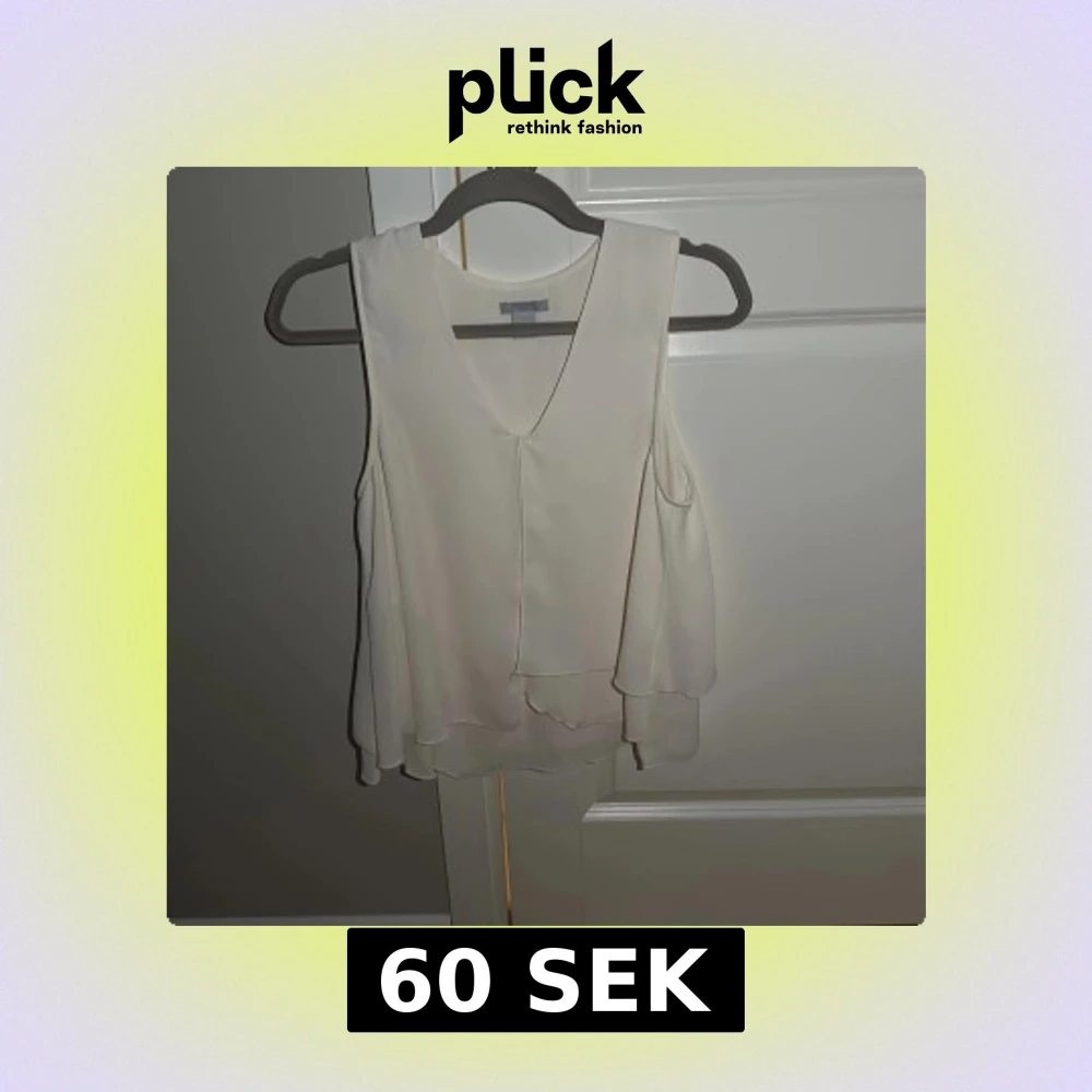 Säljer en vit ärmlös linnetopp med omlott och lager-på-lager. Toppen har v-ringning och är tillverkad i ett glansigt material som ger en lyxig sidenkänsla. Perfekt för sommarens varma dagar och enkel att styla till olika outfits.