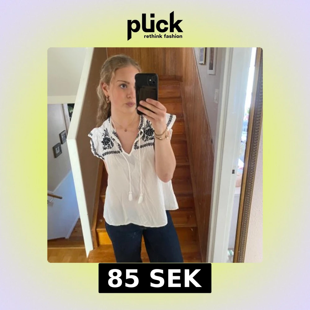 Vit blus med svarta broderade mönster vid axlar och halsringning. Blusen har korta ärmar med volangkant och knytband framtill. Luftig och lätt i materialet, perfekt för varmare dagar. Blusen är aldrig använd