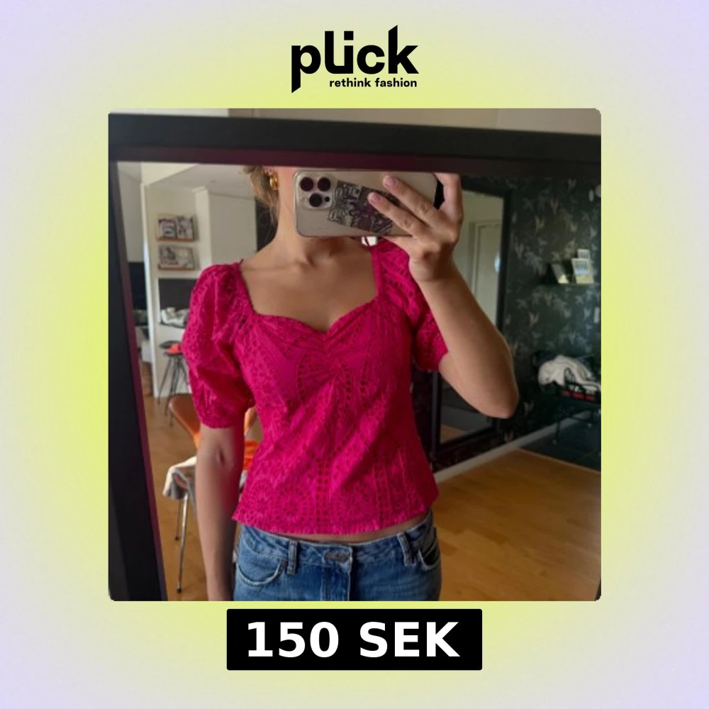 Superfin rosa blus med korta puffärmar och v-ringning. Blusen har broderade detaljer och ett genombrutet mönster som ger en unik look. Perfekt till jeans eller kjol för en färgstark outfit.