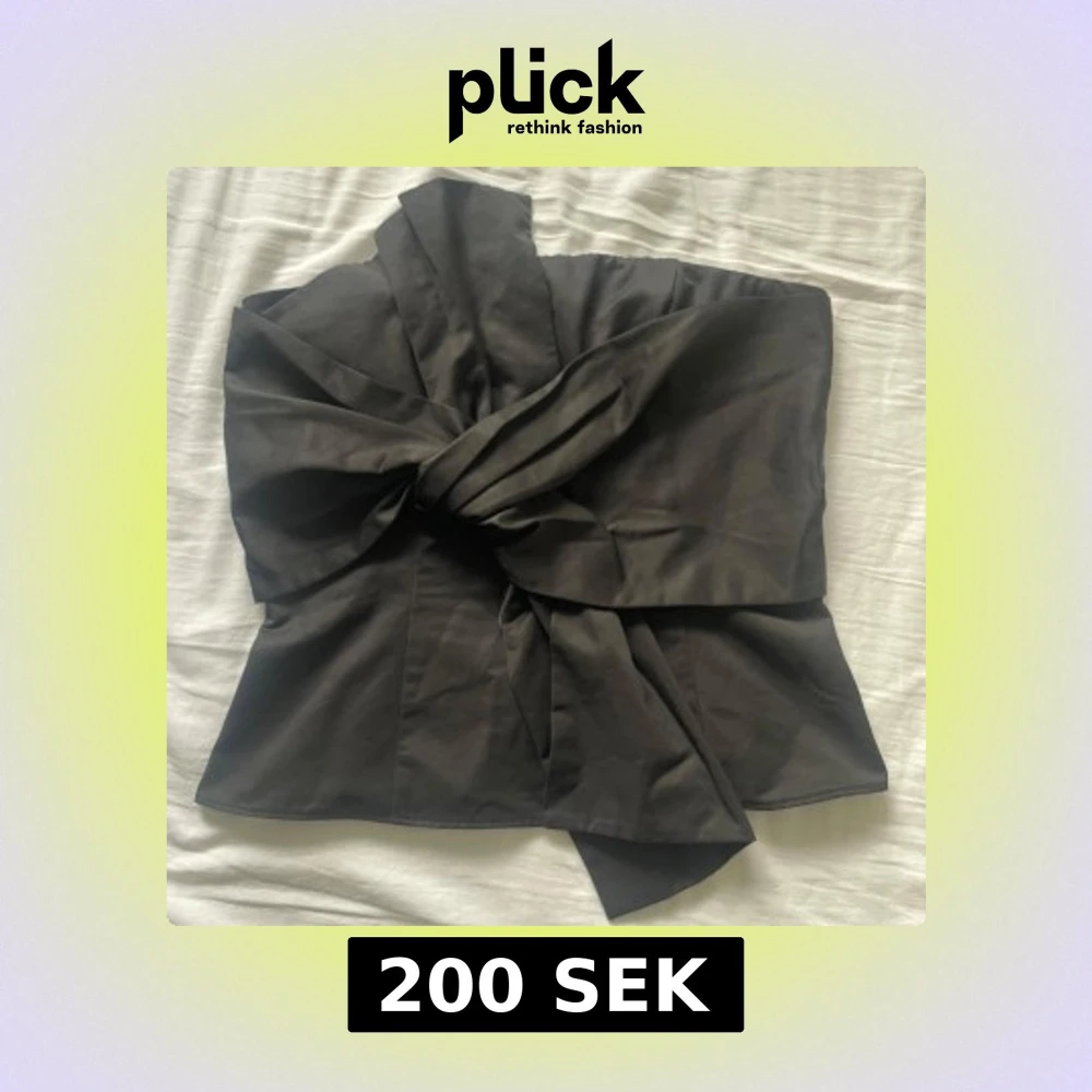 Säljer en svart axelbandslös topp från H&M i storlek 38. Toppen har en stor fejk knytdetalj framtill. Stängs med dragkedja bak och har en figurnära passform.
