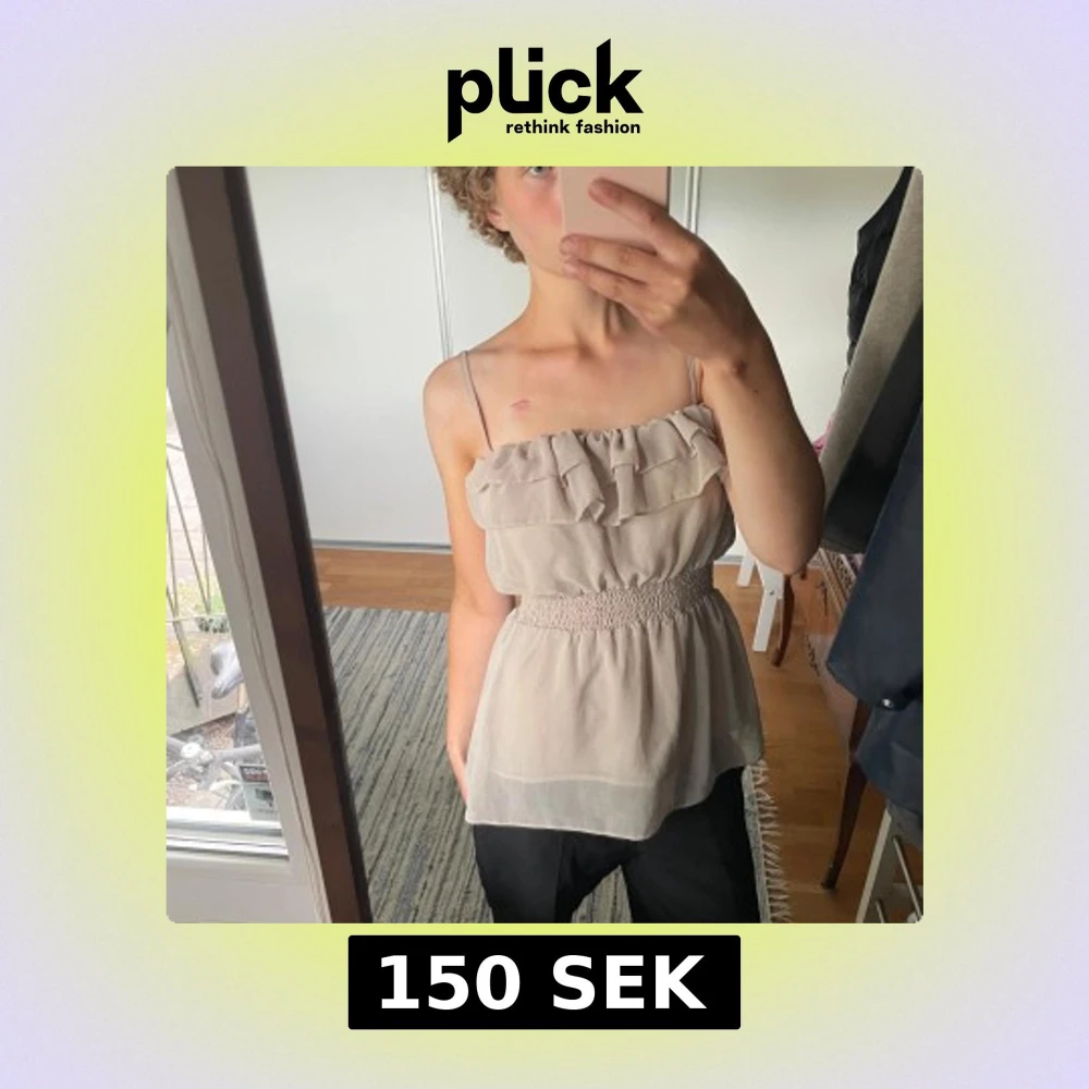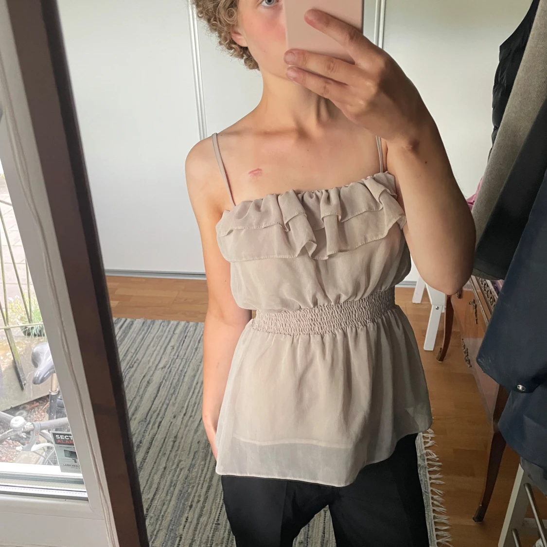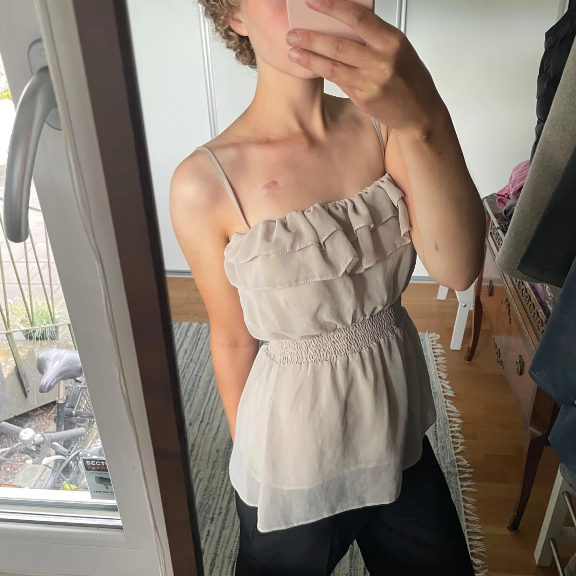 Supersöt beige linnetopp med tunna axelband och volang upptill. Toppen har smock i midjan som ger en snygg siluett och ett luftigt, flowy tyg.