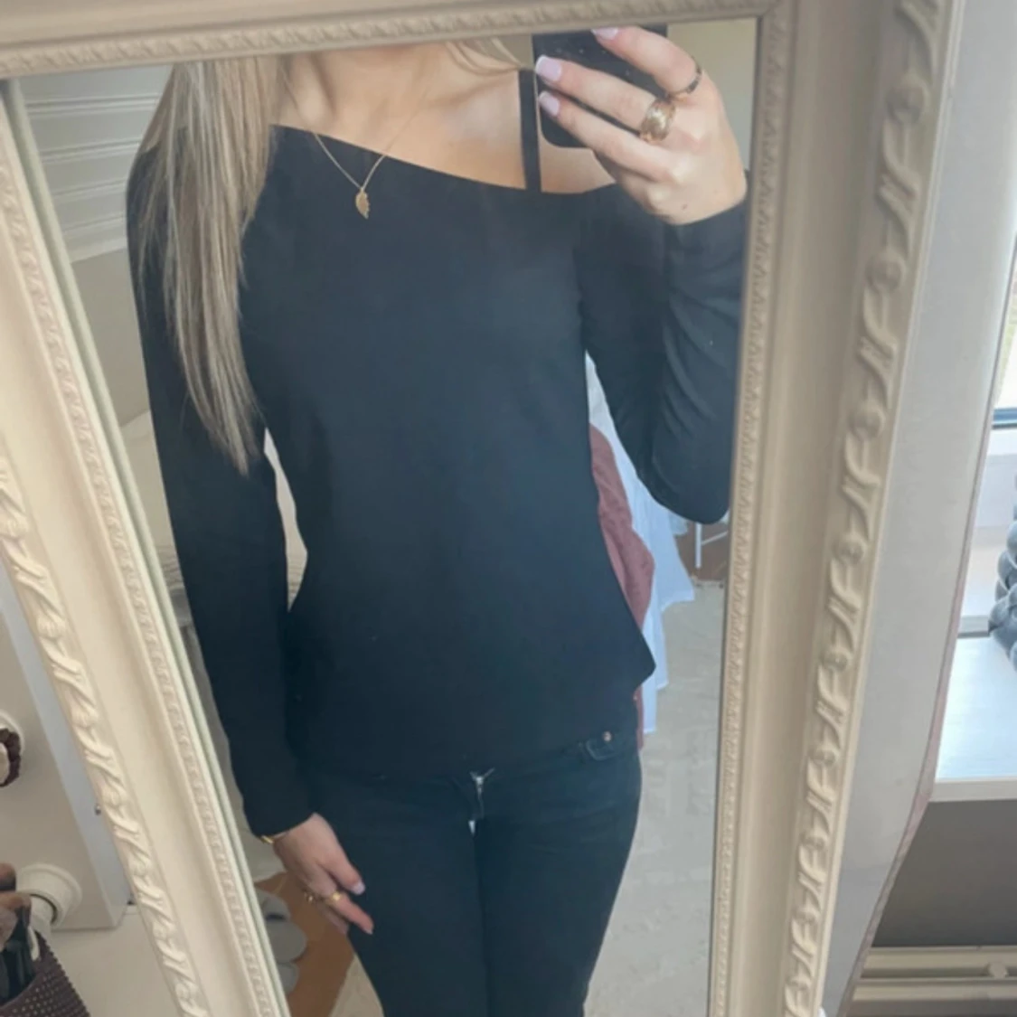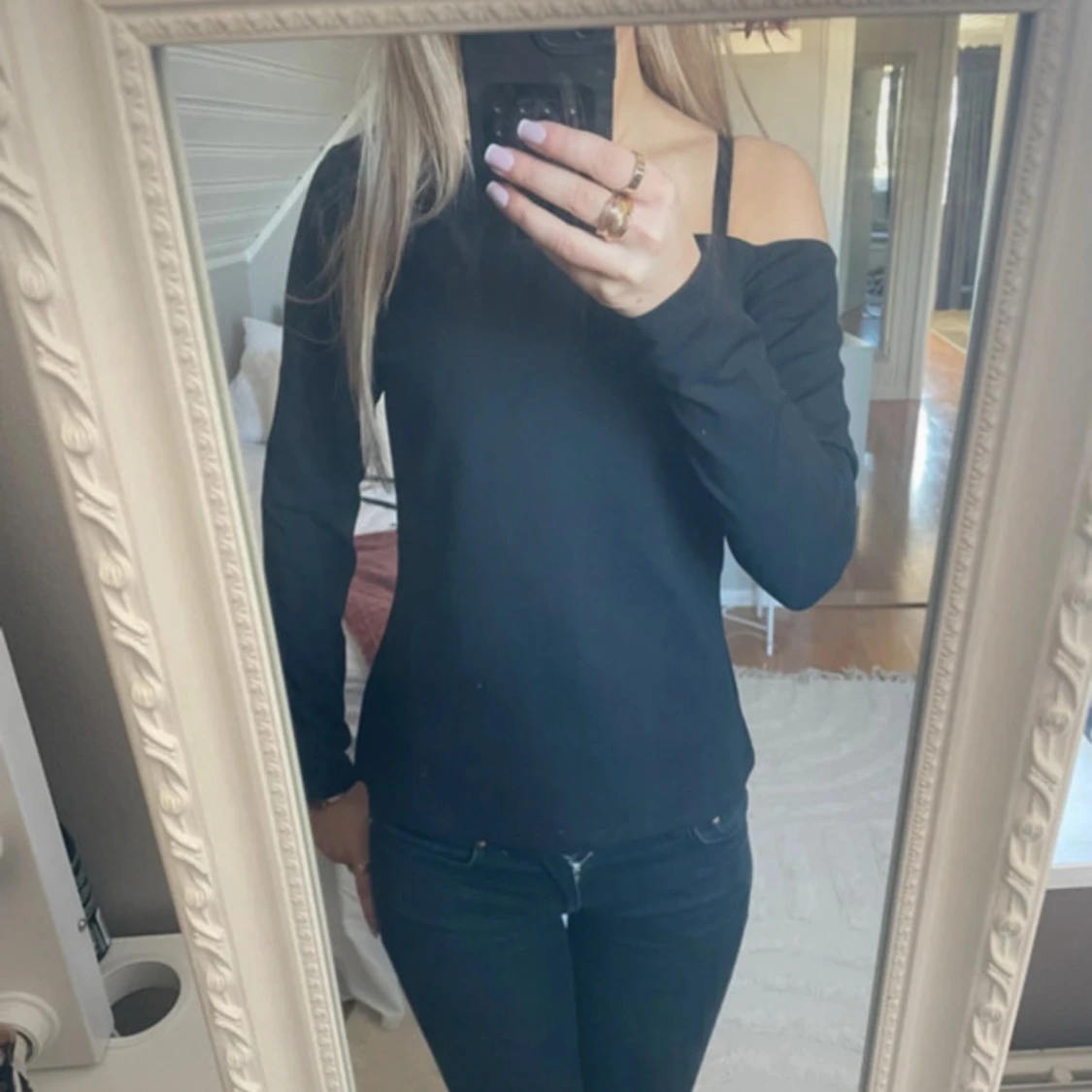 Säljer en svart långärmad topp med offshoulder-design och asymmetrisk halsringning. 🩷