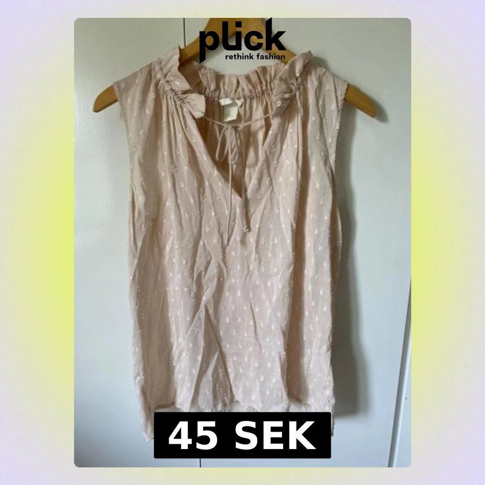 Söt ljusrosa blus med små vita prickar, volangdetalj vid halsen och knytband framtill. Ärmlös modell i tunt, luftigt tyg som passar perfekt till sommaren. Ger en romantisk och avslappnad vibe.