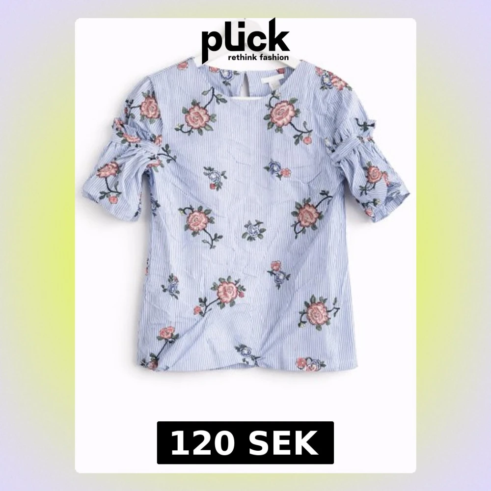 Söt blus från H&M i ljusblått med vita ränder och broderade blommor i rosa och grönt. Blusen har volangdetaljer på de korta ärmarna och en rak passform. Perfekt för dig som gillar romantiska och trendiga plagg.
