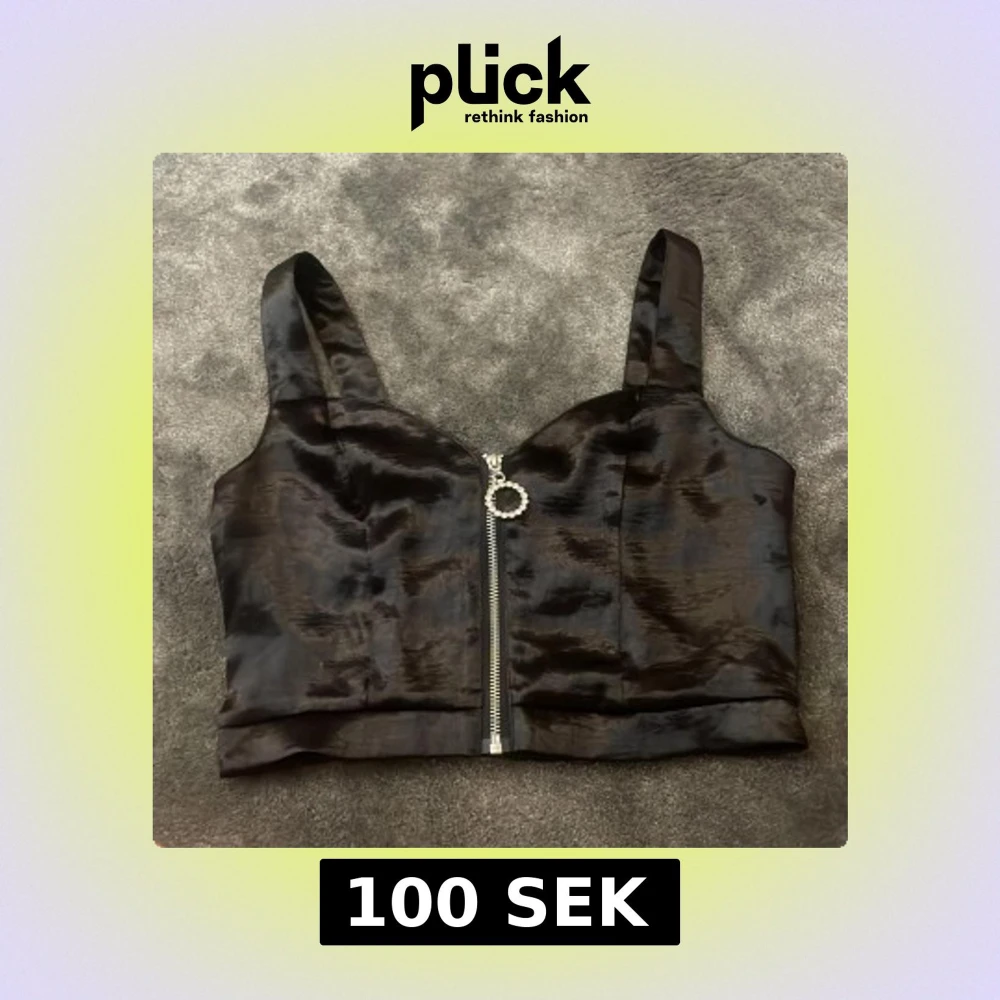 Snygg svart croppad linnetopp i glansigt material med breda axelband och dekorativ dragkedja framtill. Baksidan har smock för extra komfort och passform. Perfekt att styla till olika outfits!